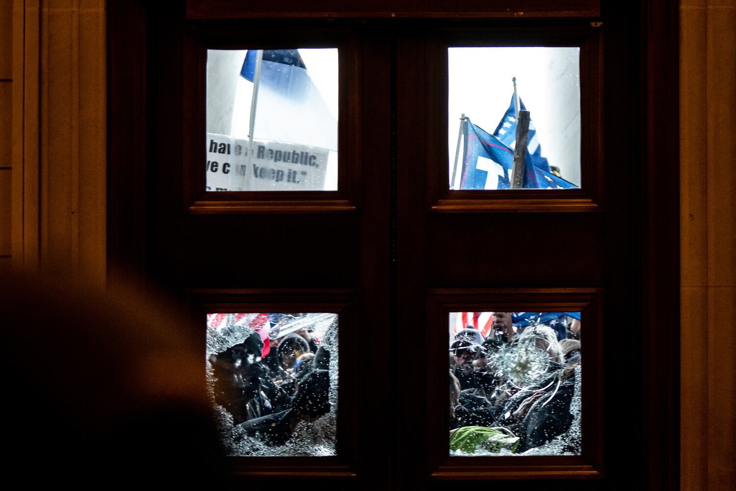 Shattered glass and a flag are seen in the Capitol after a mob of Trump supporters stormed the building Wednesday, Jan. 6, 2021, on the same day as a joint session of Congress met to certify the electoral votes from the 2020 presidential election. President Trump’s efforts to overturn the 2020 presidential election came to a dangerous head on Wednesday when a mob of his supporters stormed the Capitol following a rally in which Trump once again falsely claimed widespread voter fraud. (Anna Moneymaker/The New York Times)