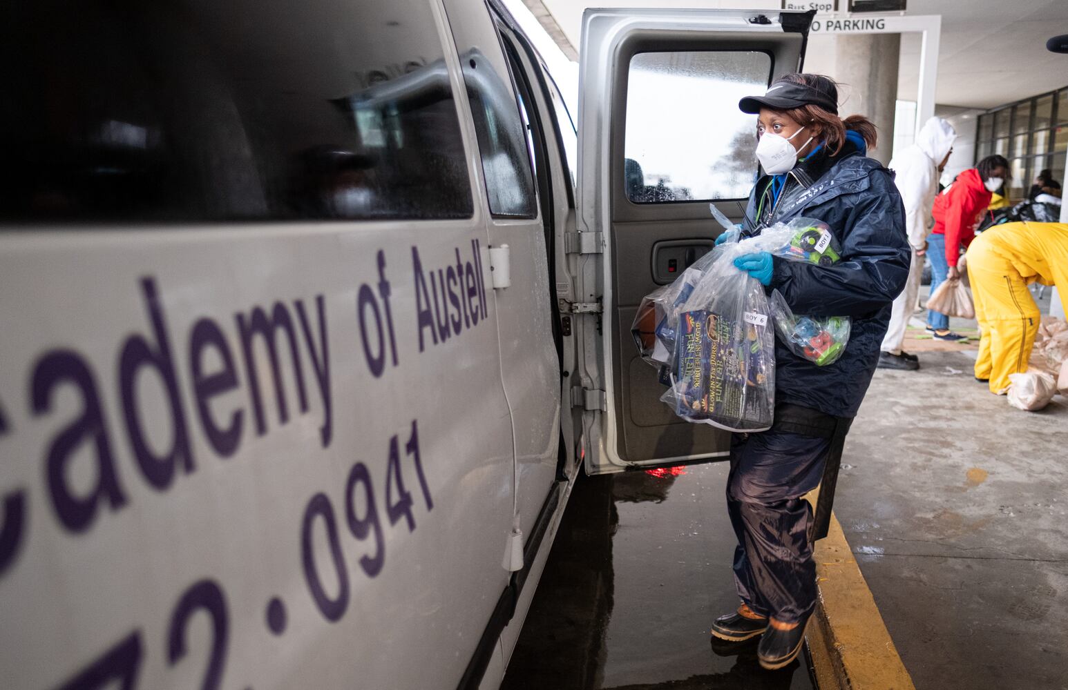 201224-Atlanta-Vera Allen, center, a volunteer with Hosea Feed the Hungry, brings a bag of toys to a car during the Christmas Eve Toy Drive-Thru on Thursday afternoon, Dec. 24, 2020 at the Georgia World Congress Center. Ben Gray for the Atlanta Journal-Constitution
