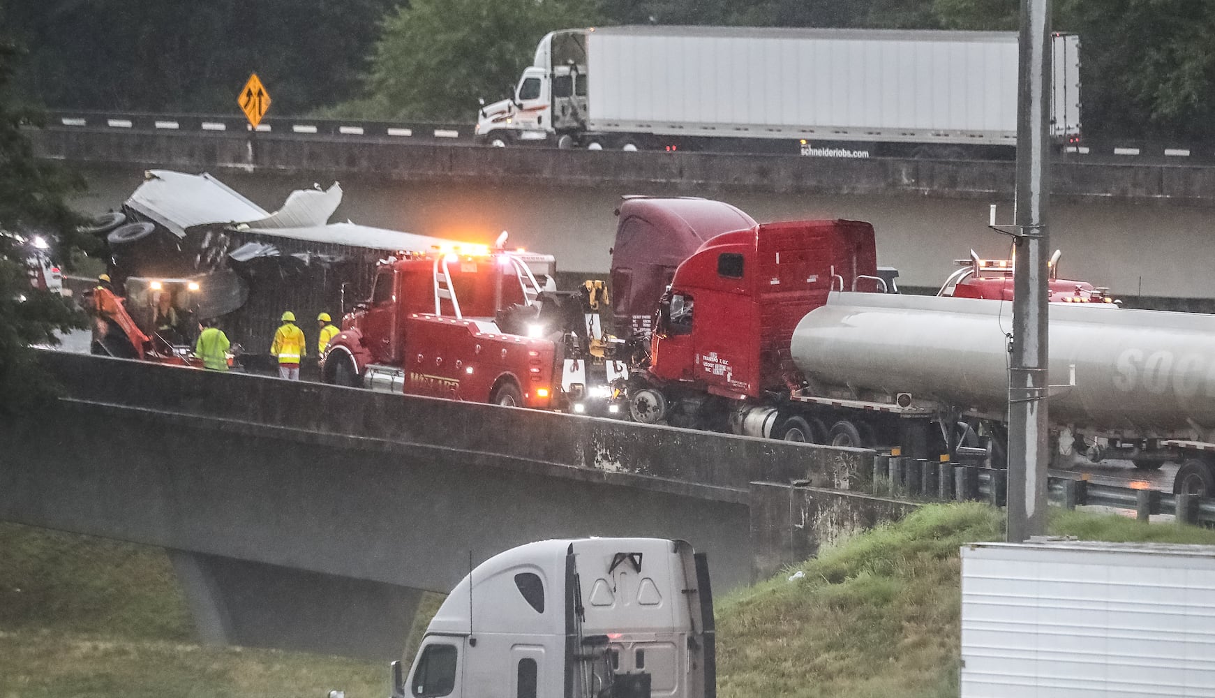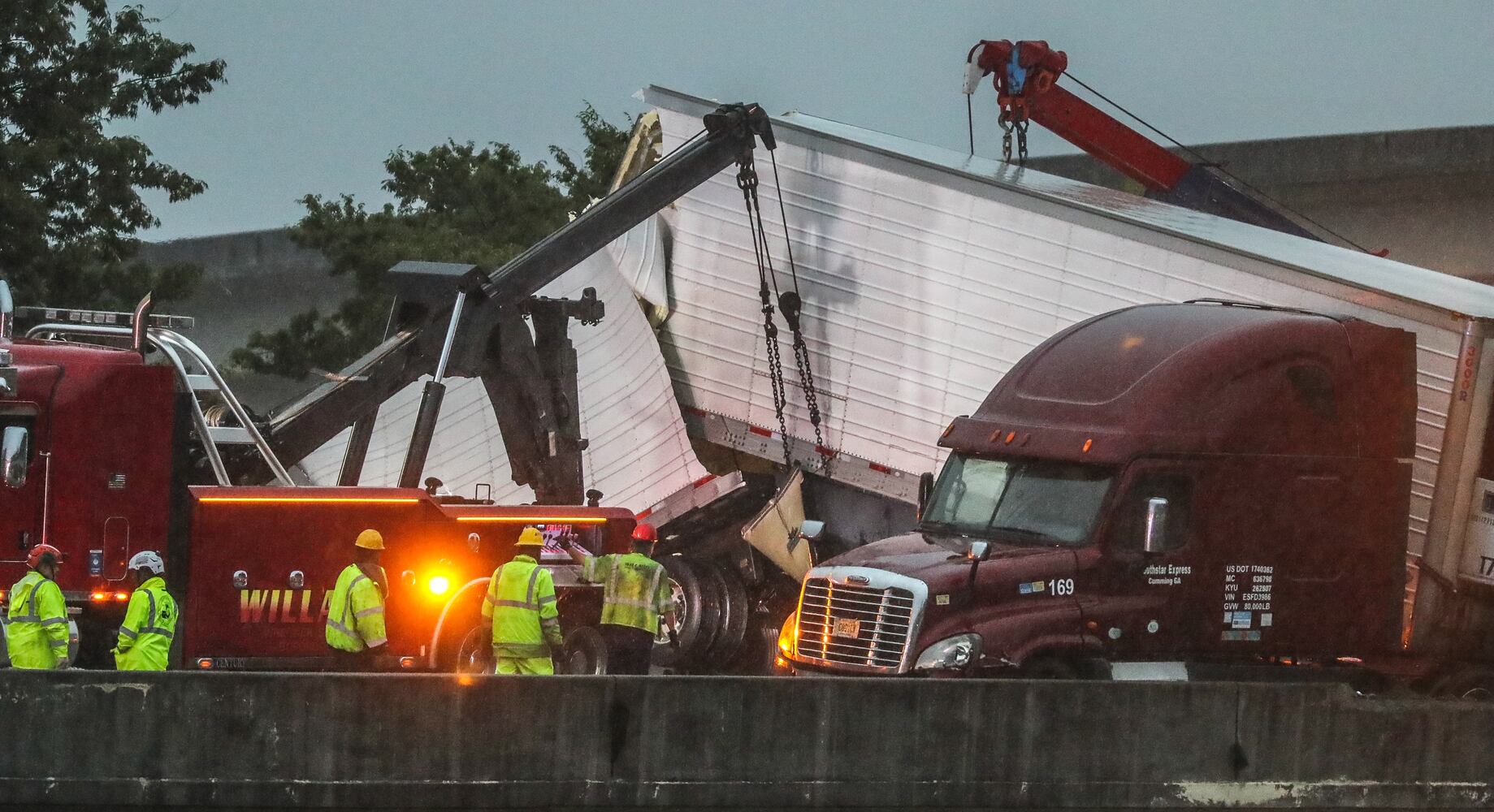 Two tractor-trailers collided at the ramp from I-285 East to I-85 North, blocking it early Monday morning.