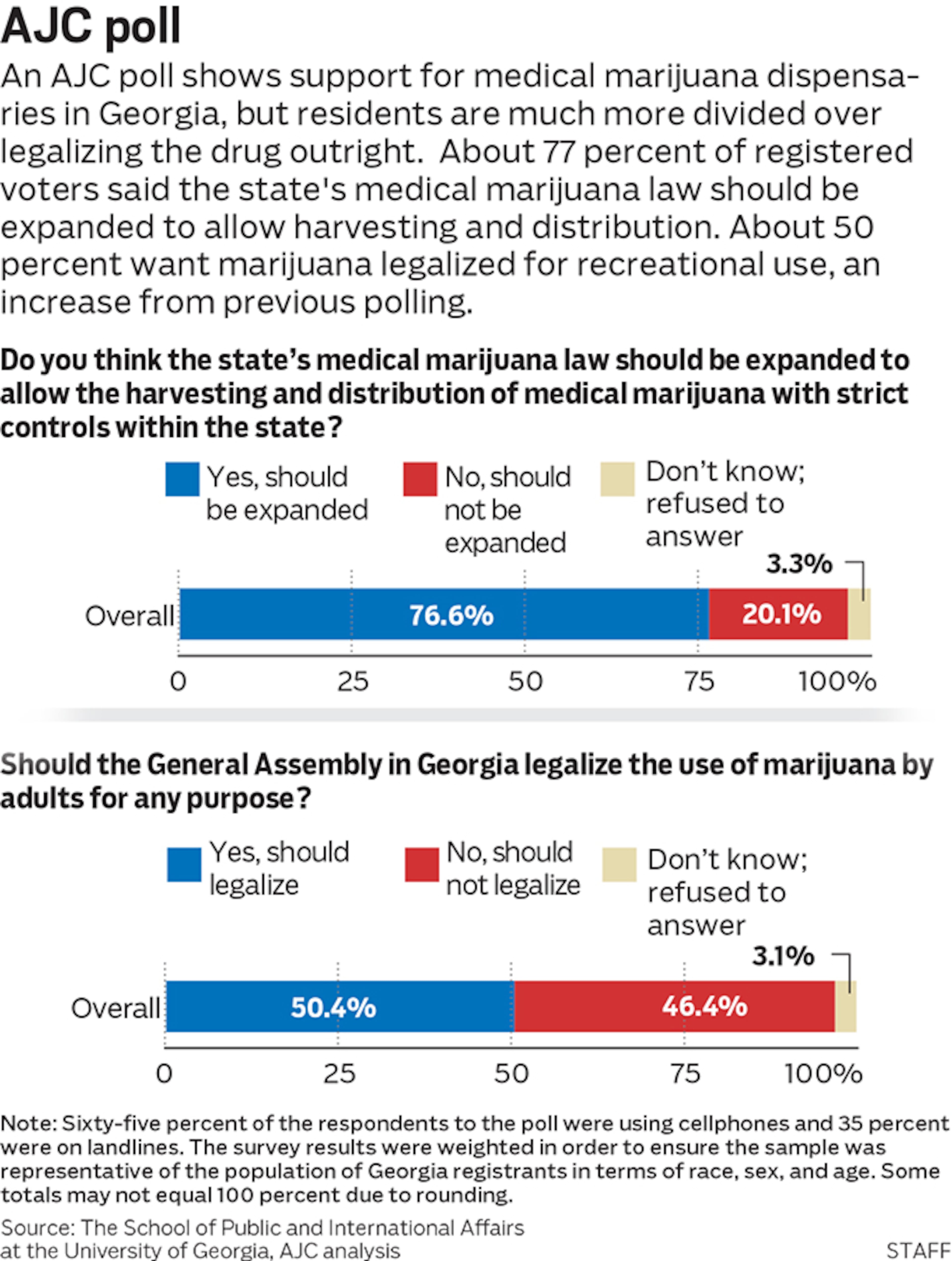 More Georgia voters than ever support changing state law to allow harvesting and distribution of medical marijuana, according to a poll by The Atlanta Journal-Constitution.