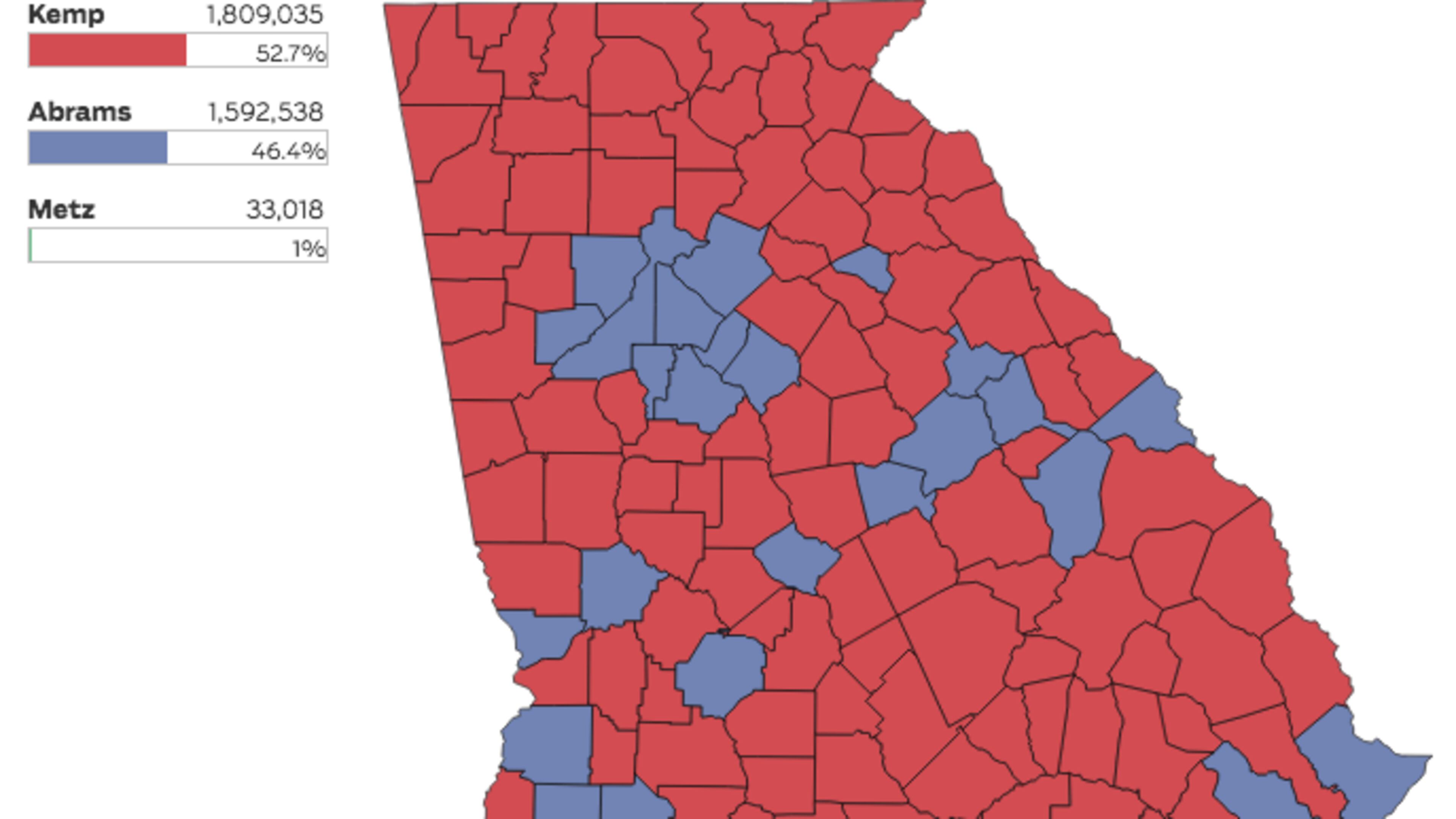 County level results for the Nov. 6, 2018 Gubernatorial race between Stacey Abrams, Brian Kemp and Ted Metz. This map will update live as results are posted.