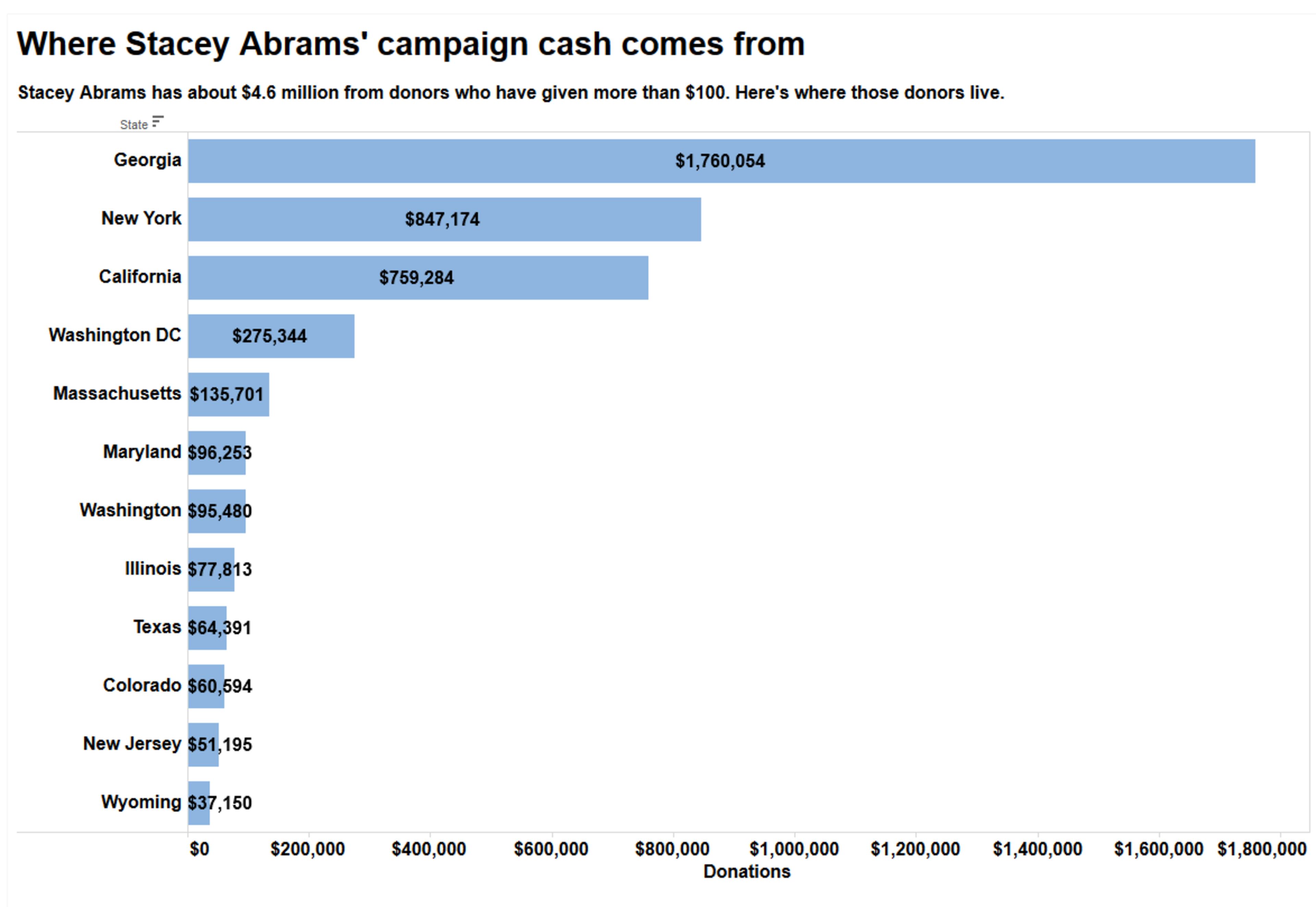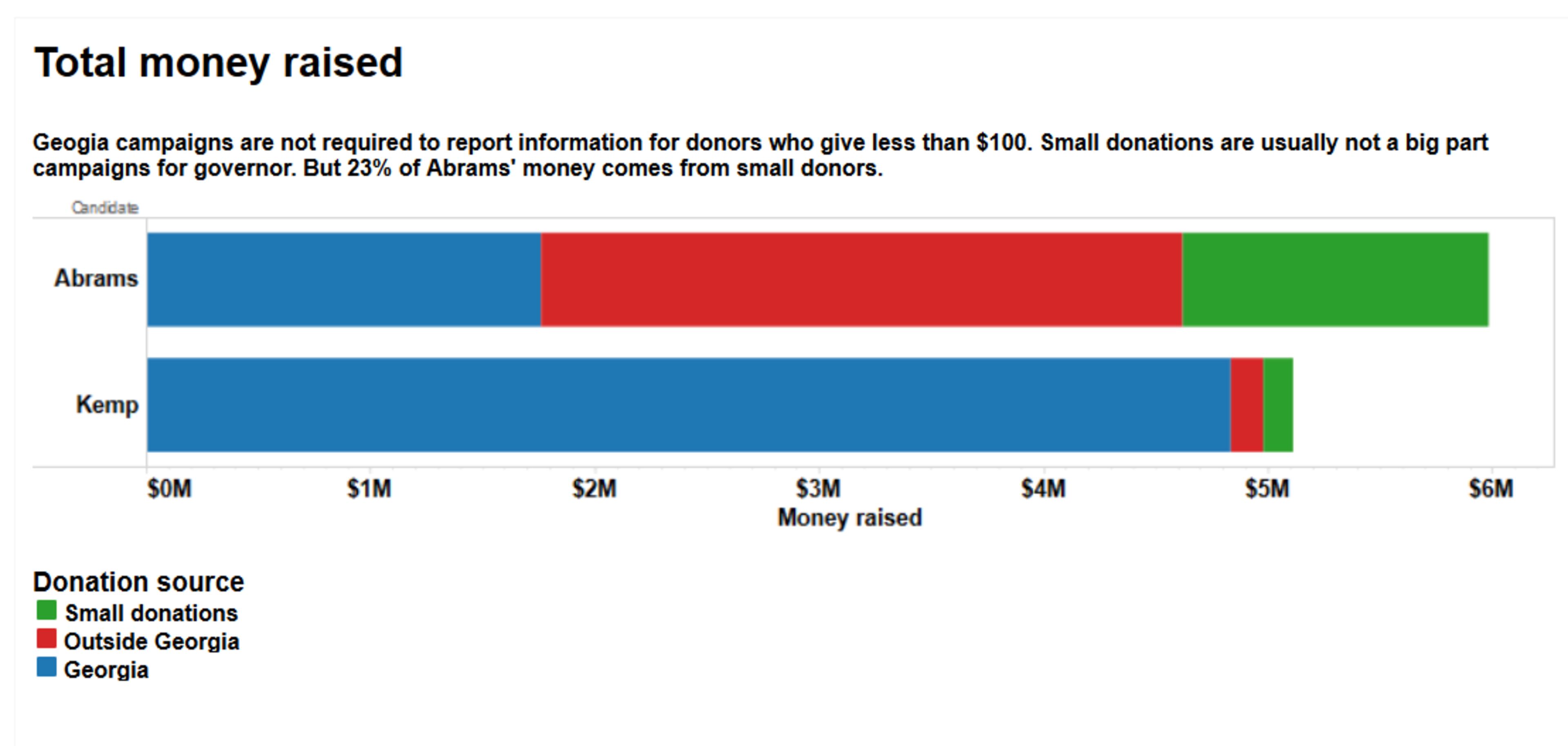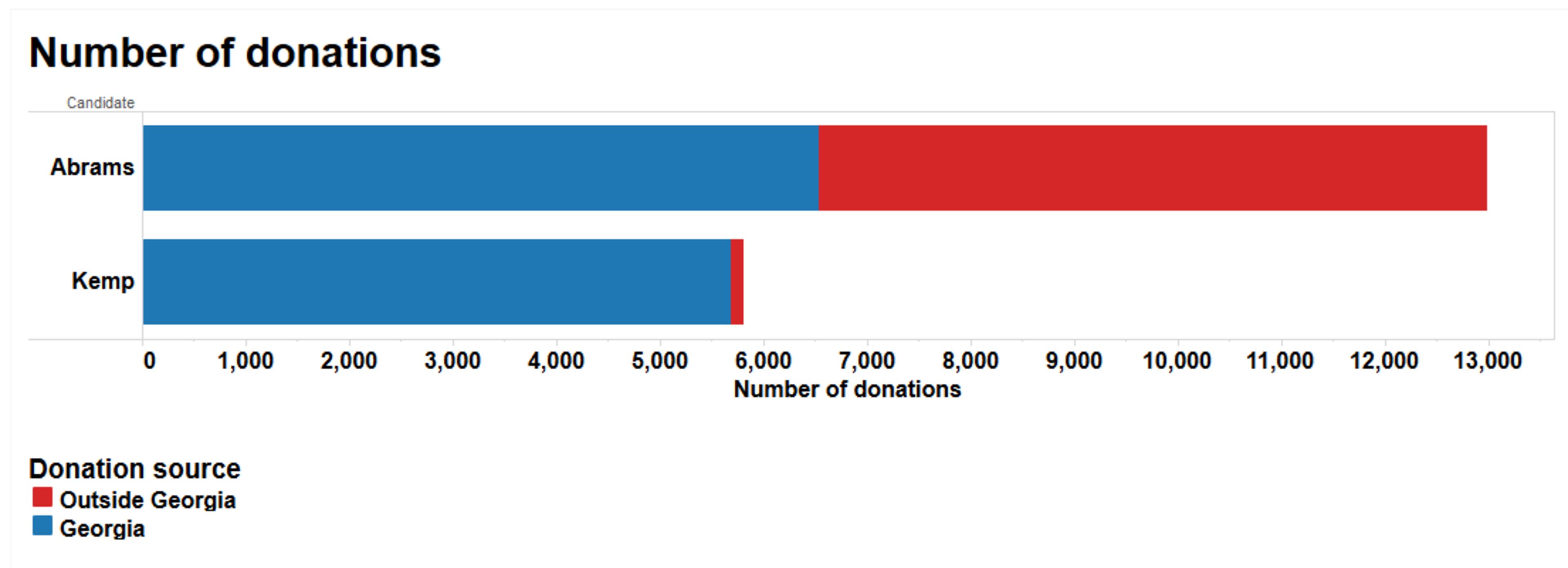 Abrams received hundreds of thousands of dollars more from donors who chipped in more than $100 through small increments of $5 or $10 or $20. Of those itemized contributions, Abrams received more than 3,200 donations from Georgians and about 2,600 from outside the state.