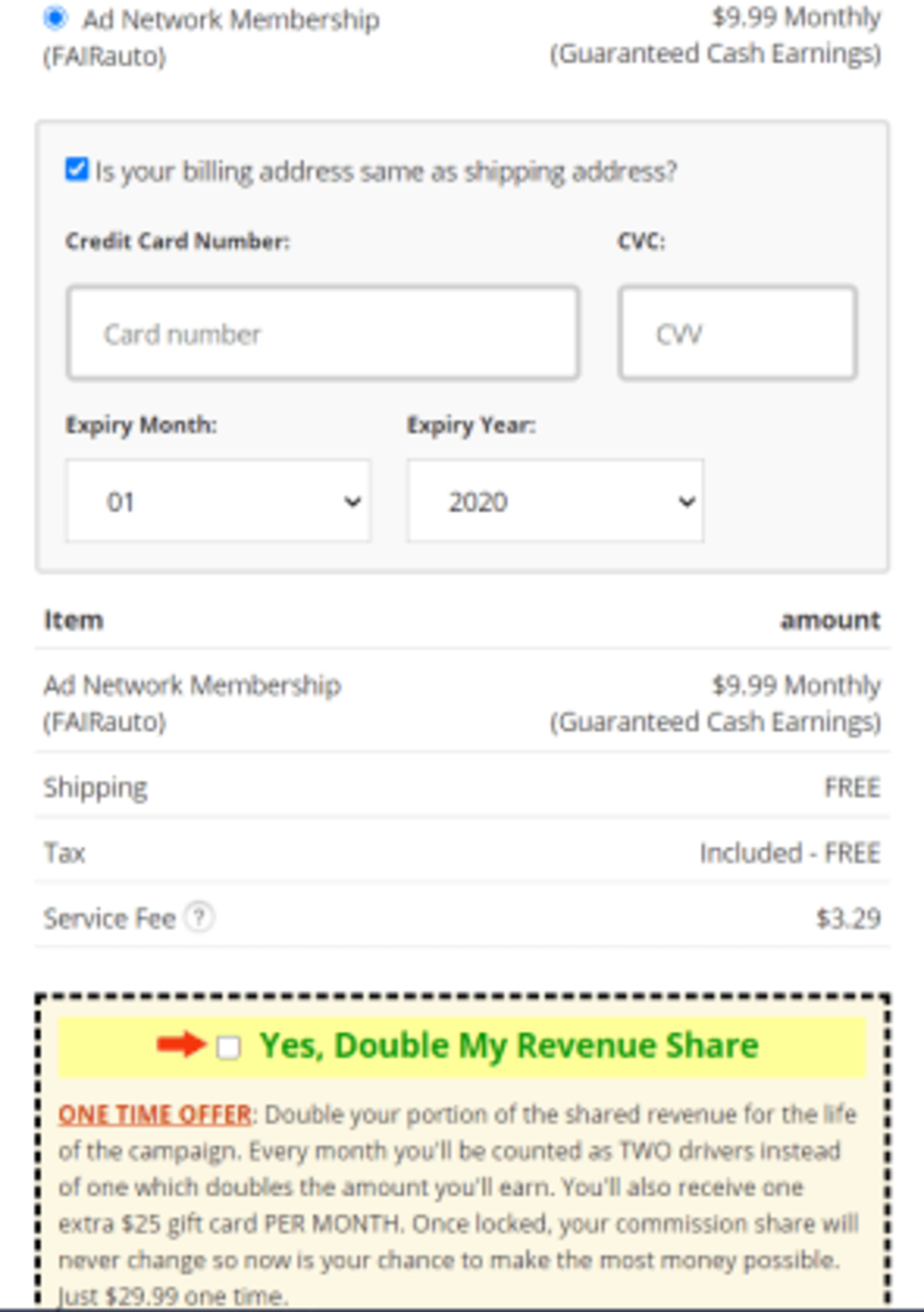 To get started, you have to pay for a membership ($7.99 to $9.99 per month depending on the campaign you select), a one-time service fee ($3.29) and the decals themselves (price varies). You also have upgrade options: a one-time “double your revenue” fee ($29.99), a one-time “5x pay” fee for four extra stickers ($49.99) and a premium package to get free shipping and decals for life ($19.95).
