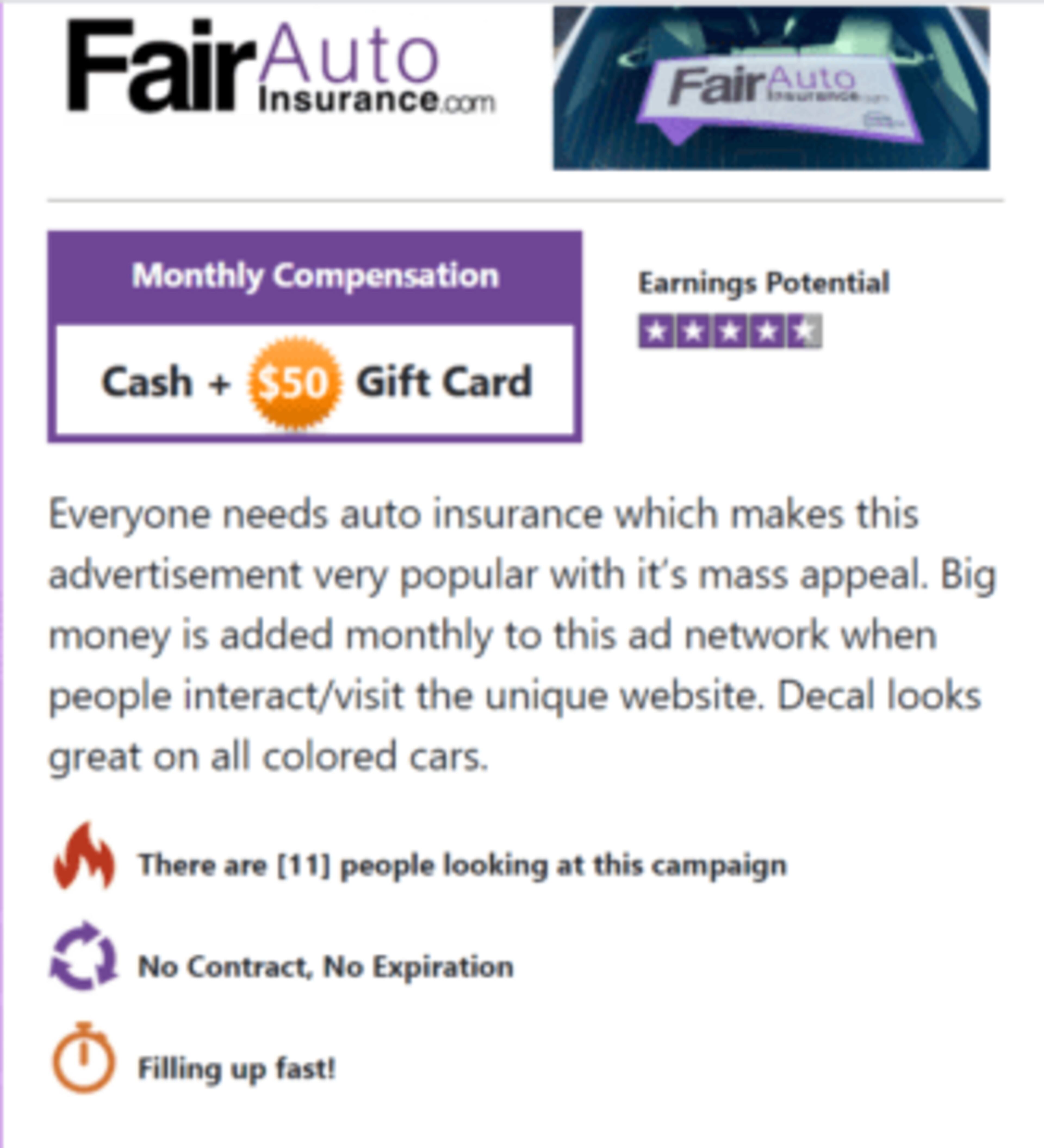 As I mentioned previously, you can choose which company that you want to advertise on your car. Stickr.co provides some basic information about its campaigns and shows you what the sticker will look like before you commit.