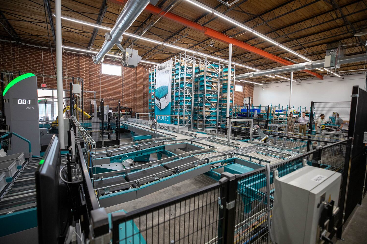 Dozens of robots scurry about a warehouse in Armour Yards in a choreographed dance to organize products among rows of identical bins.