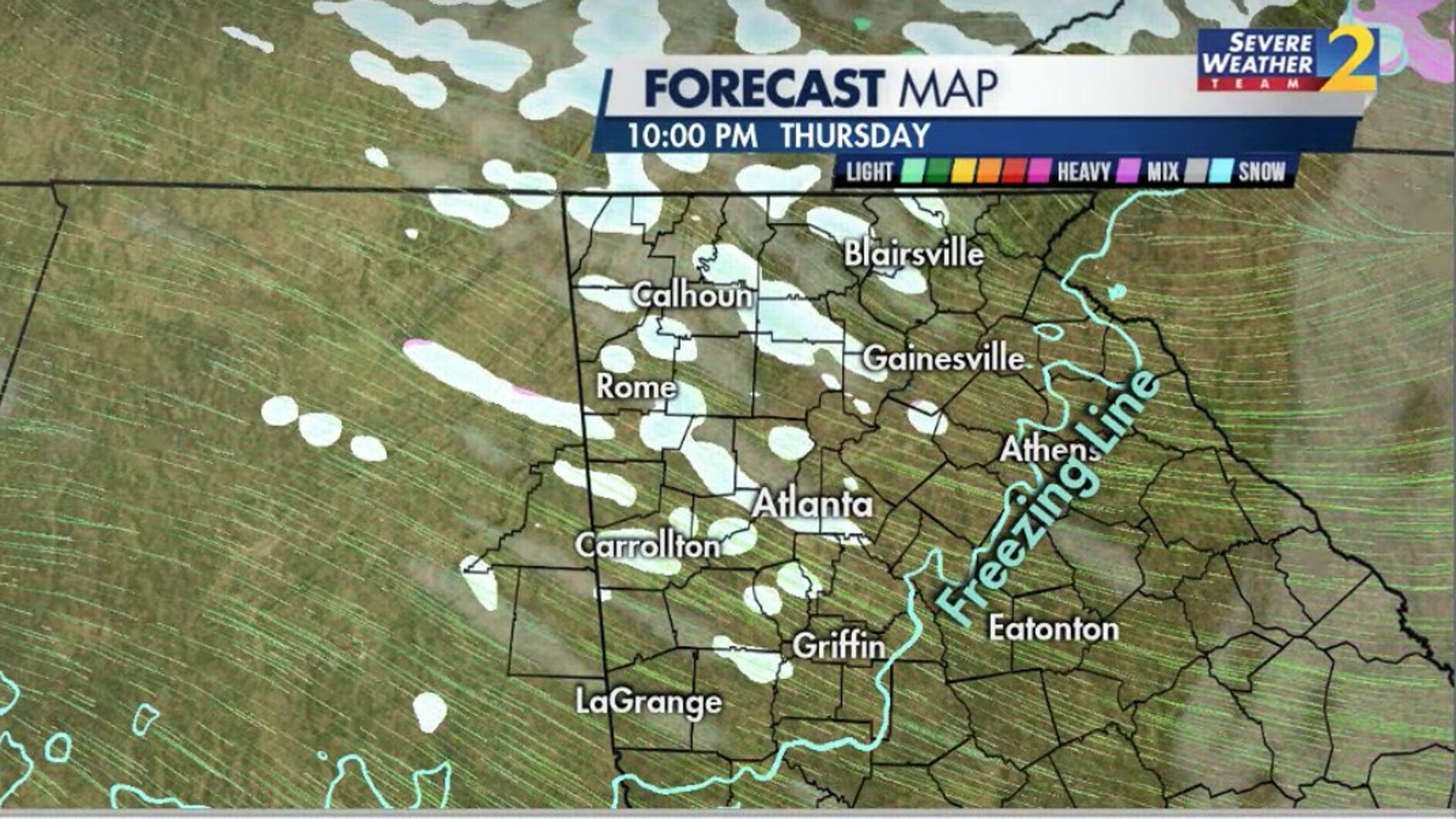 Up to two inches are possible in northeast Georgia, but metro Atlanta residents will likely only see a light dusting, Channel 2 Action News meteorologist Eboni Deon said.