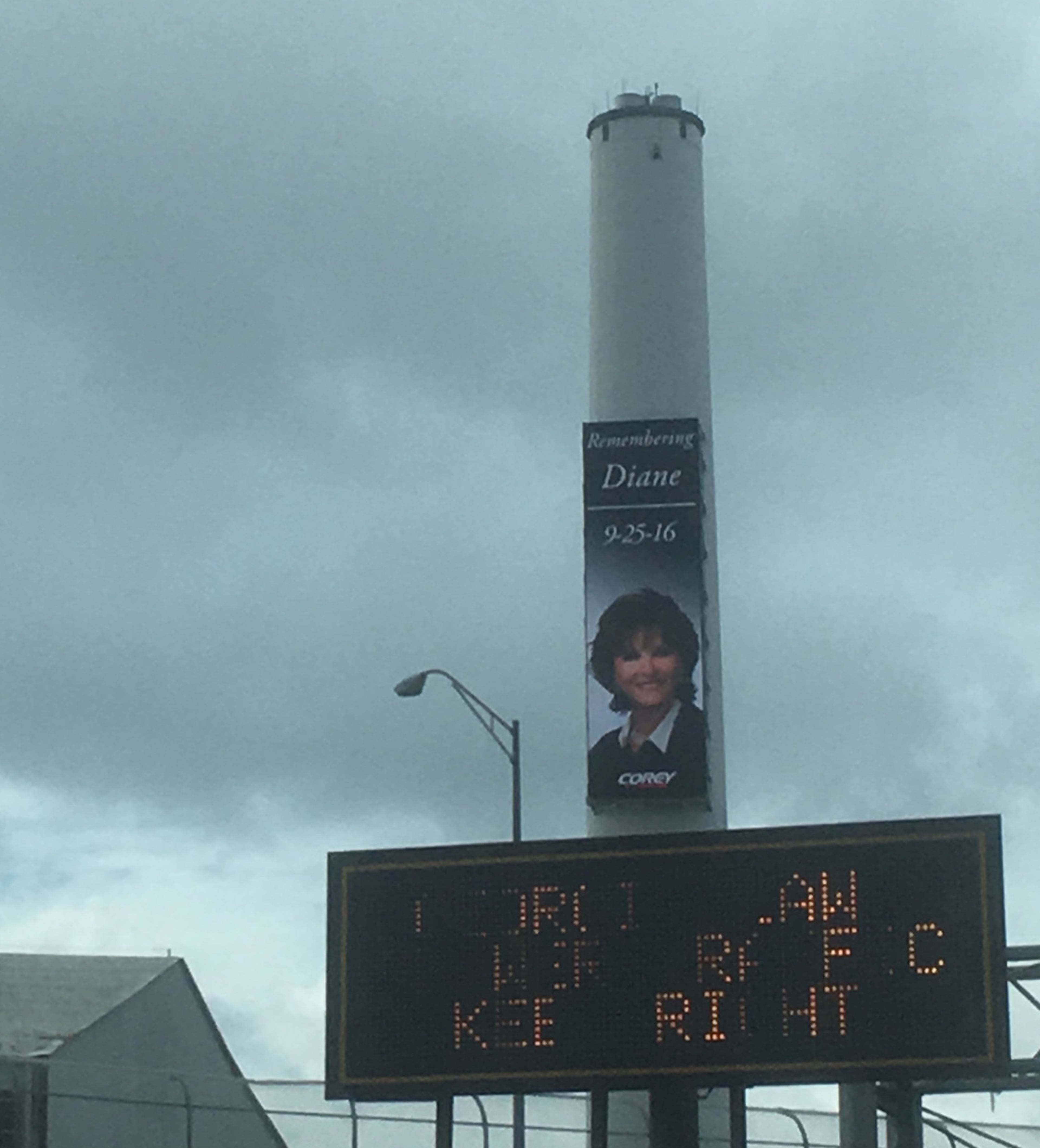 On the second anniversary of Diane’s death, the Corey tower at the downtown Connector was lit up with an image of Diane and a message of tribute.