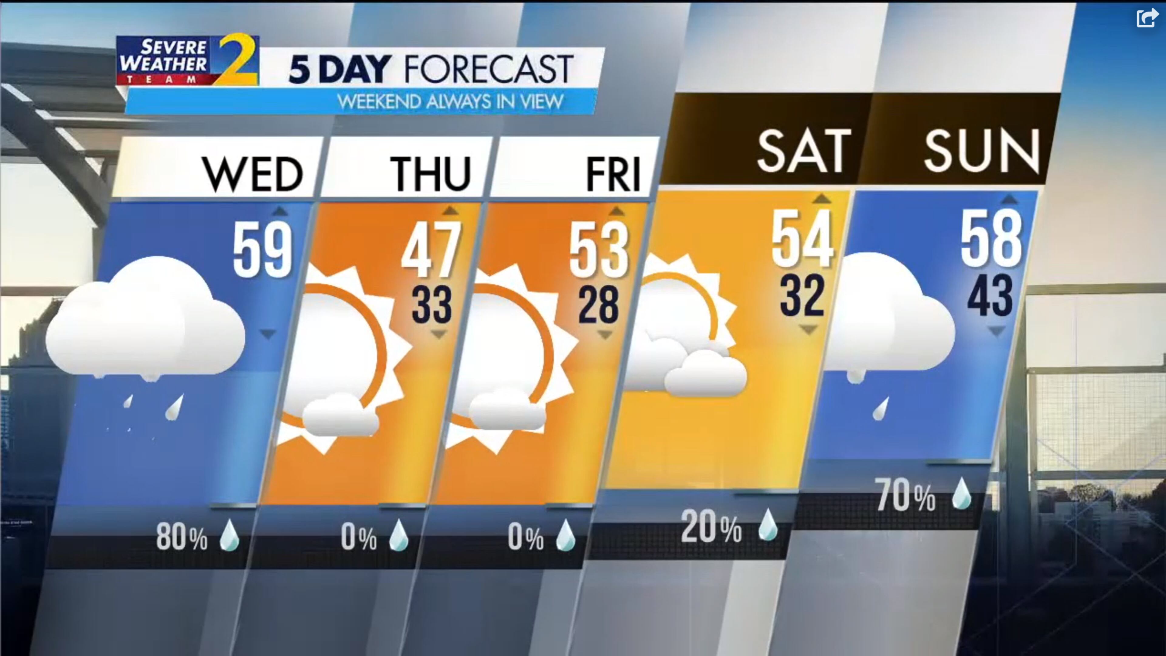 There is no risk of severe weather Wednesday, according to Channel 2. Monahan said the morning hours will see the worst of the wet weather, but another round of rain is in the forecast to complicate the evening drive.
