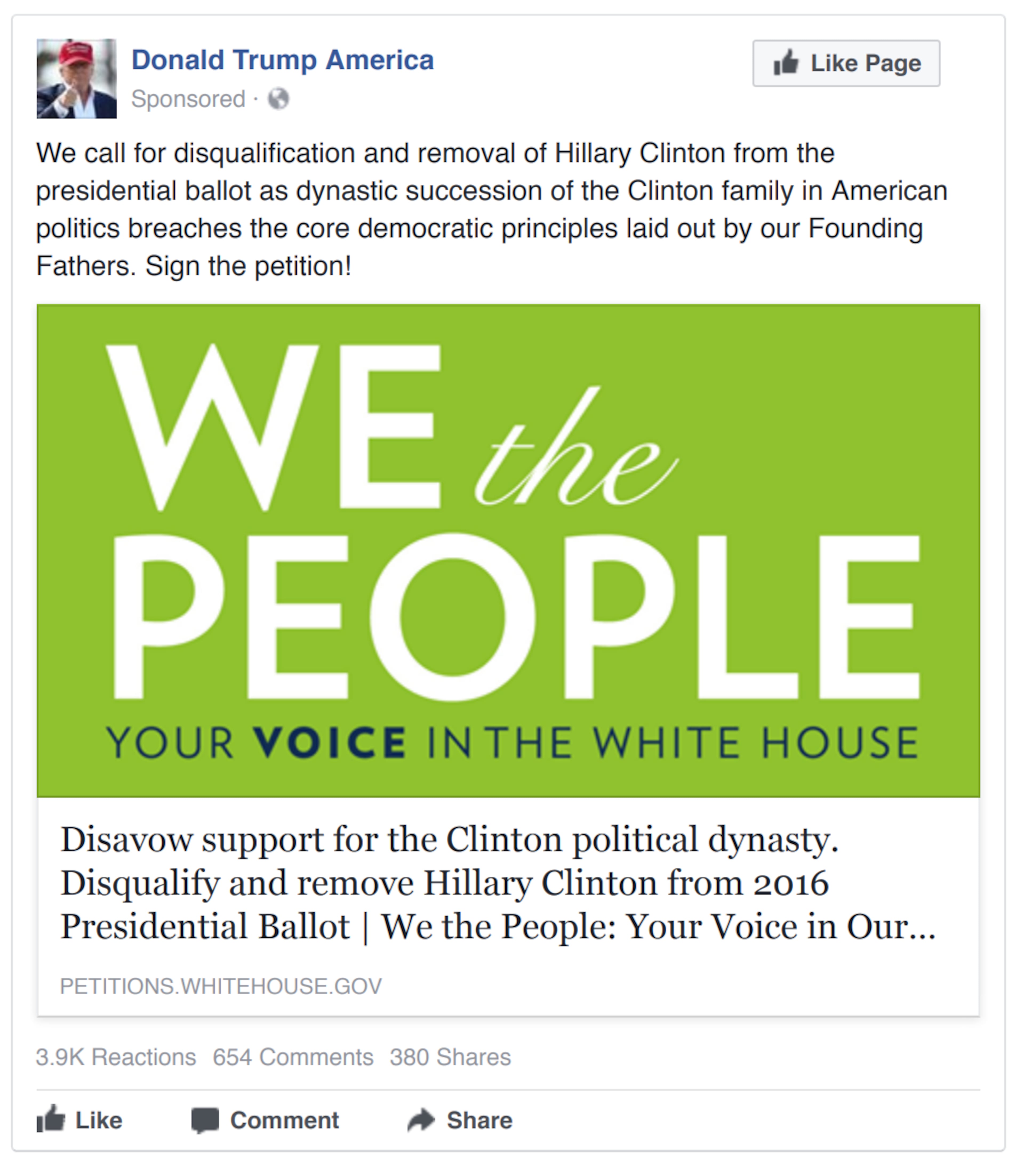 Note that the post is labeled as sponsored (under the “Donald Trump America” page title).