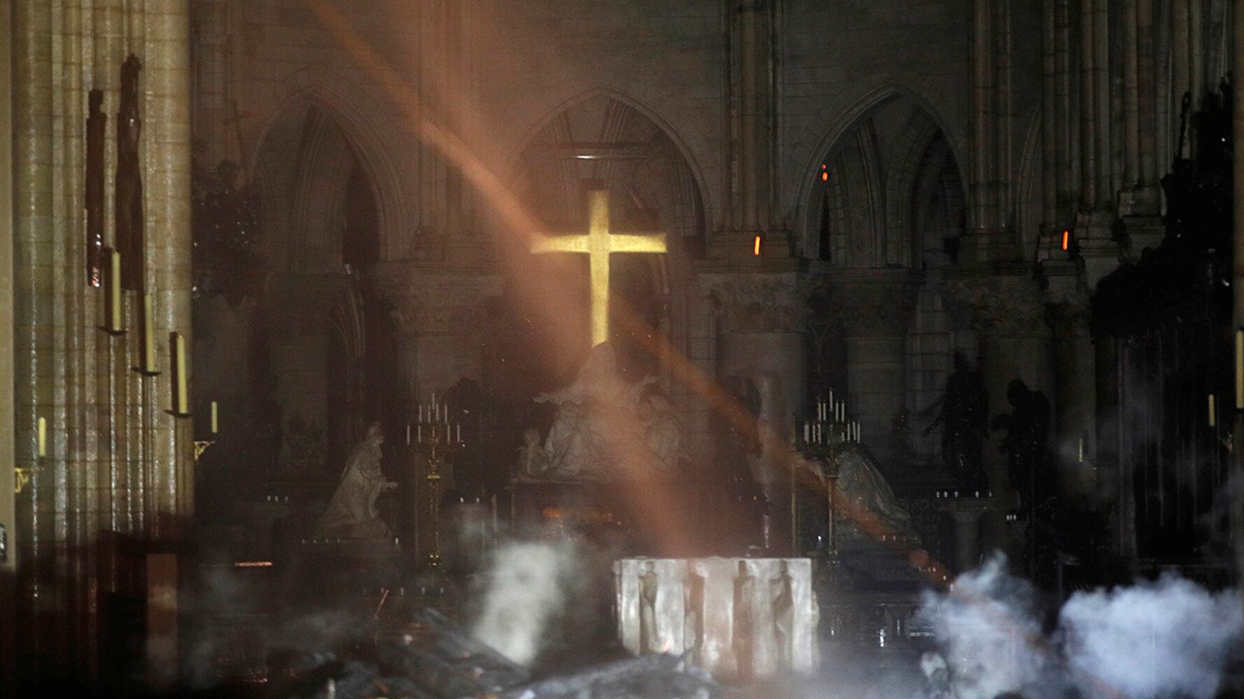 Flames and smoke rise as the spire on Notre Dame cathedral collapses in Paris, Monday, April 15, 2019. Massive plumes of yellow brown smoke is filling the air above Notre Dame Cathedral and ash is falling on tourists and others around the island that marks the center of Paris.