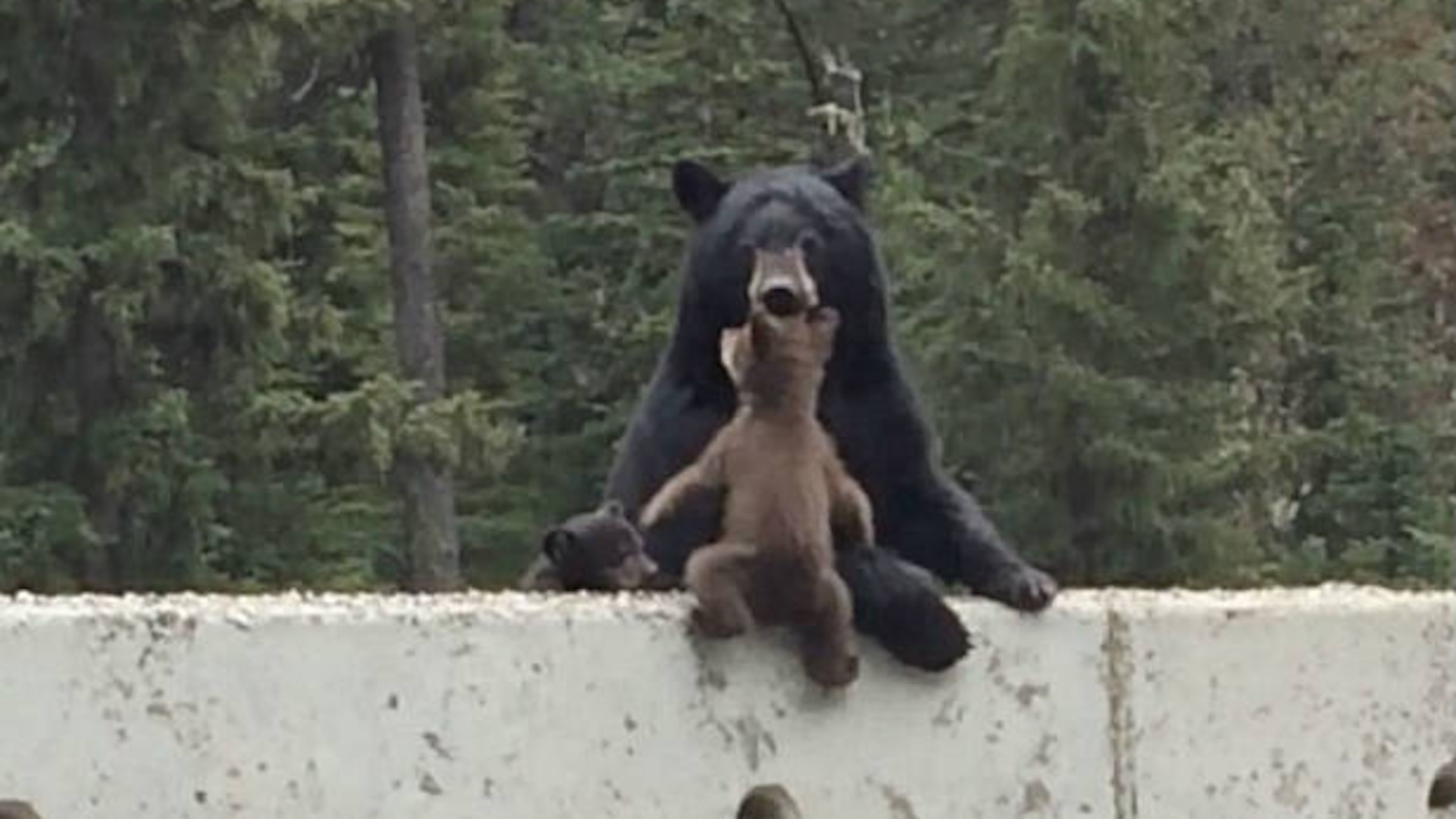 Just in time, mama bear's maternal instincts kick in and with a second cub by her side, she reaches over the cement boundary and pulls her little cub up by its head and to safety.