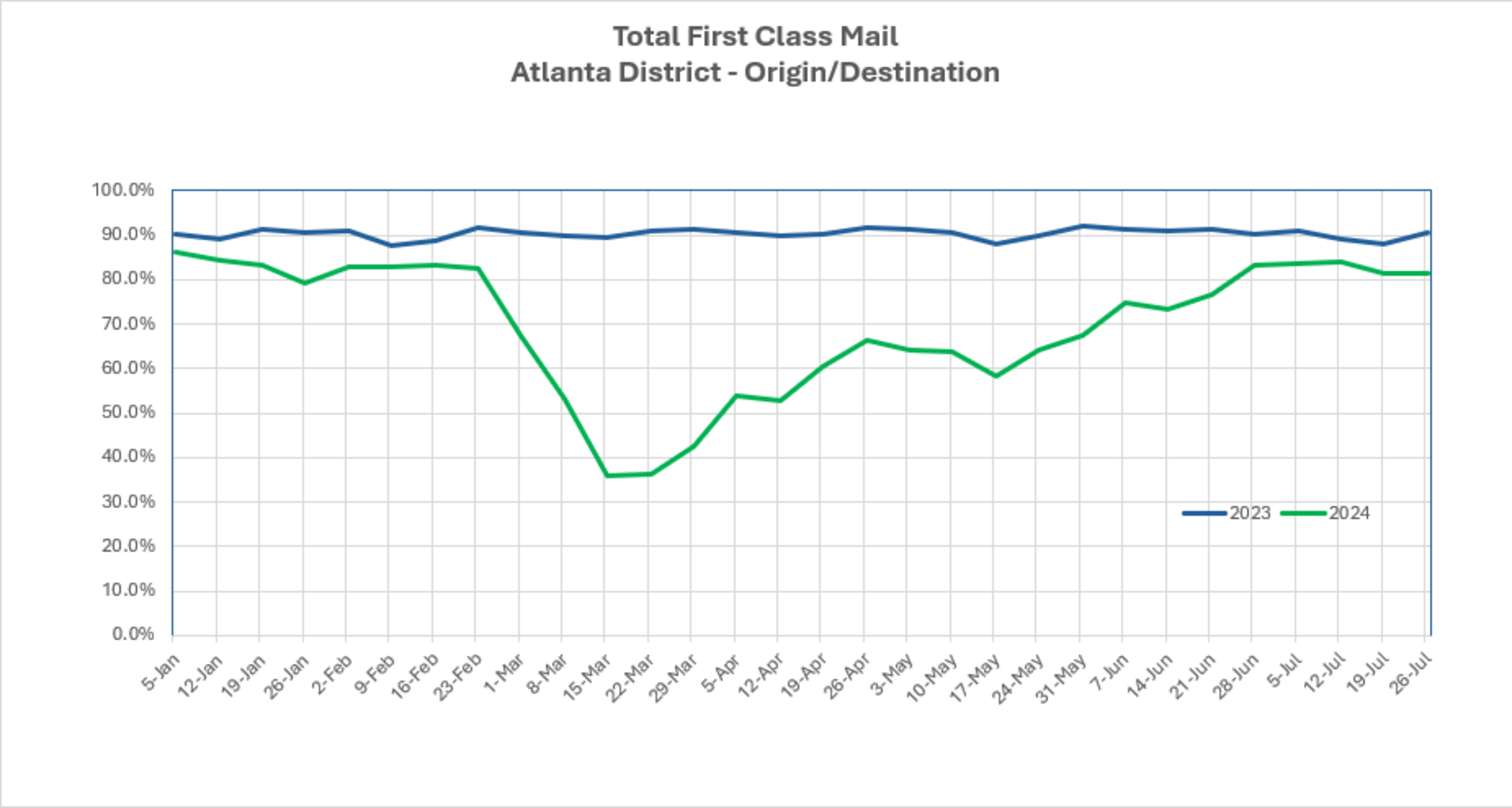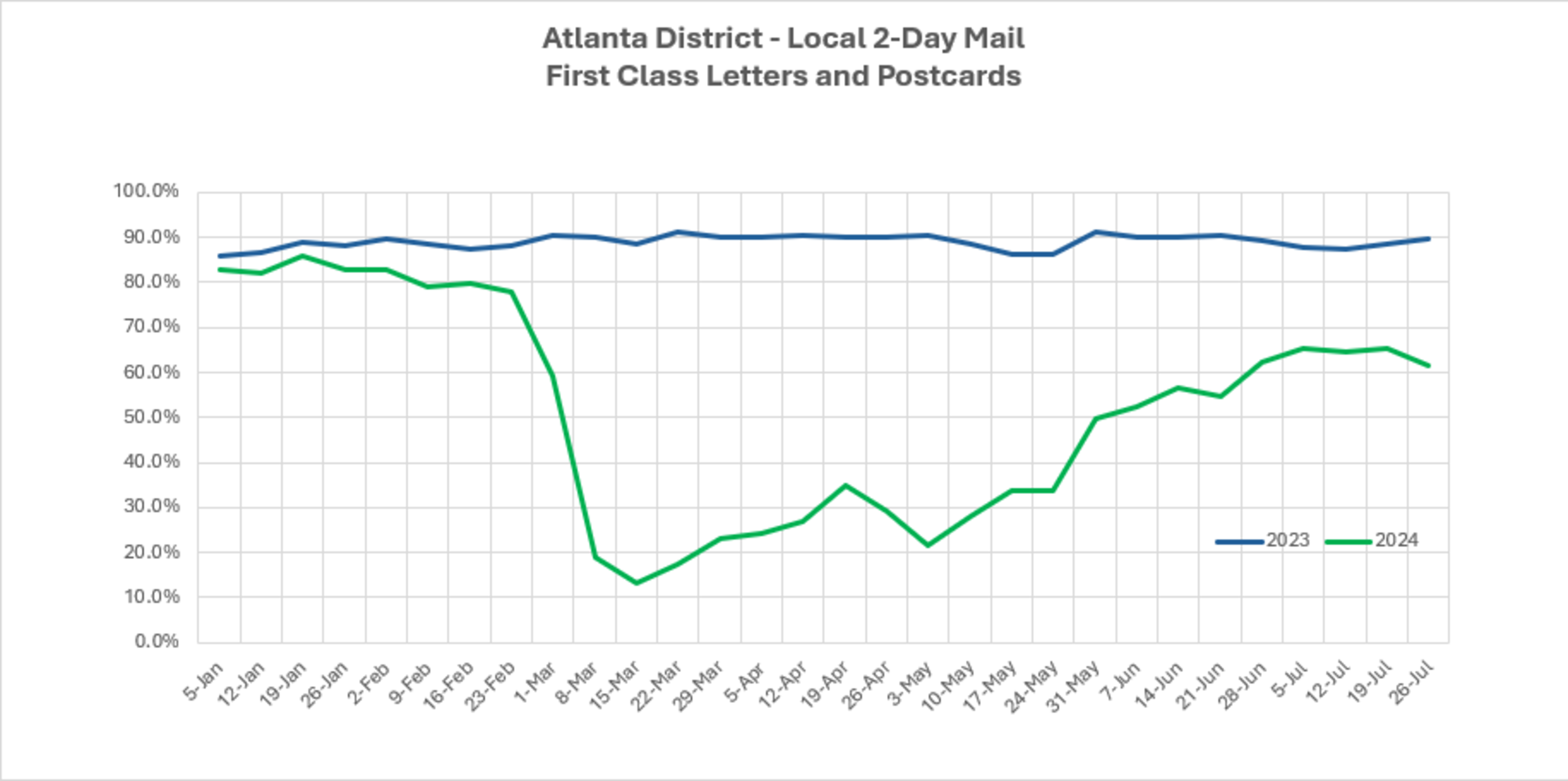 Added to financial performance is a significant decline in service. In fiscal year 2024 to date, the on-time performance for first-class mail is 85.6% compared with 91.5% in 2023, with a goal of 95%. In the USPS Atlanta District, the first-class mail performance is 72.6% compared with 89.8% in 2023. Perhaps more troubling is that local two-day service in Georgia is at 65.5% compared with 88.4% in 2023.