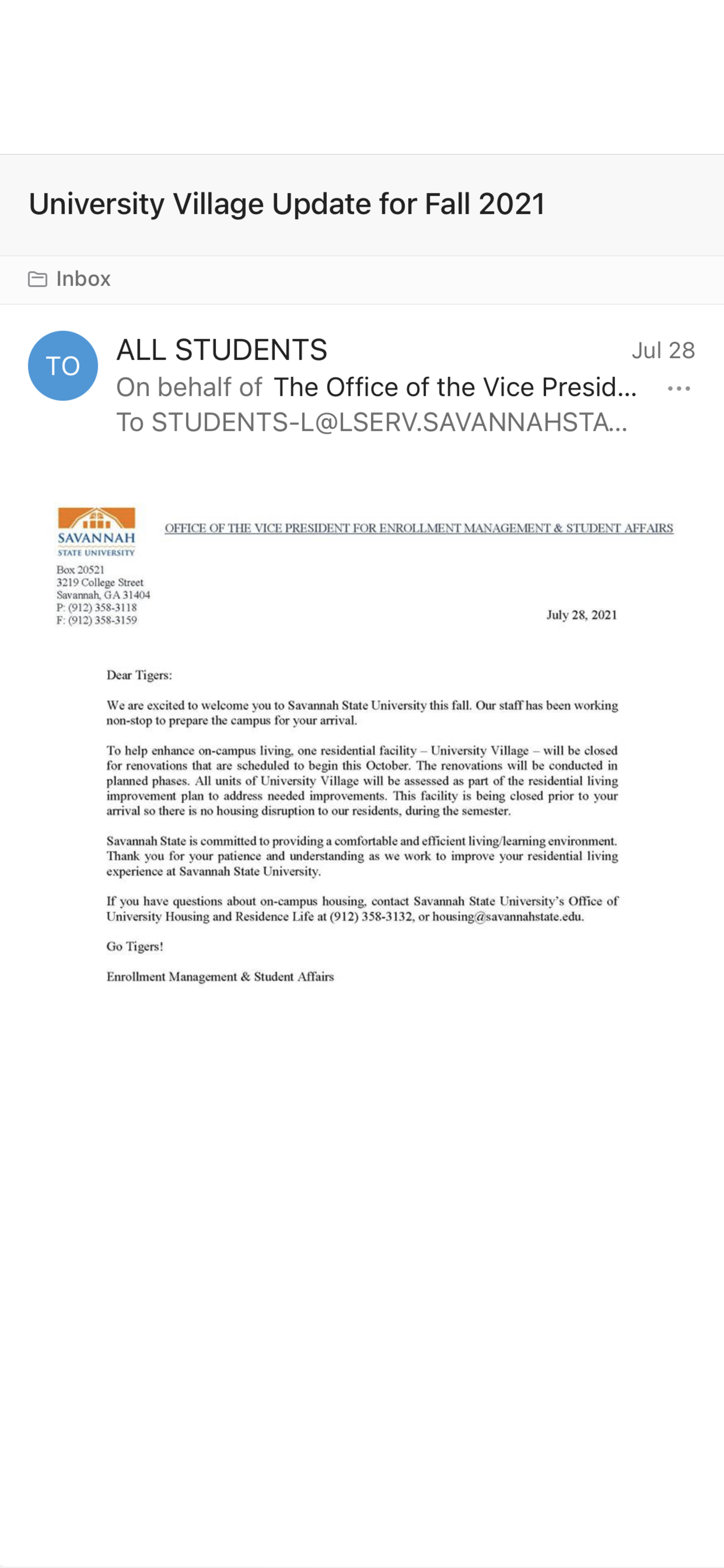 "To help enhance on-campus living, one residential facility — University Village will be closed for renovations that are scheduled to begin in October. The renovations will be conducted in planned phases. All units of University Village will be assessed as part of the residential living improvement plan to addressed needed improvements. This facility is being closed prior to your arrival so there is no housing disruption to our residents during the semester."