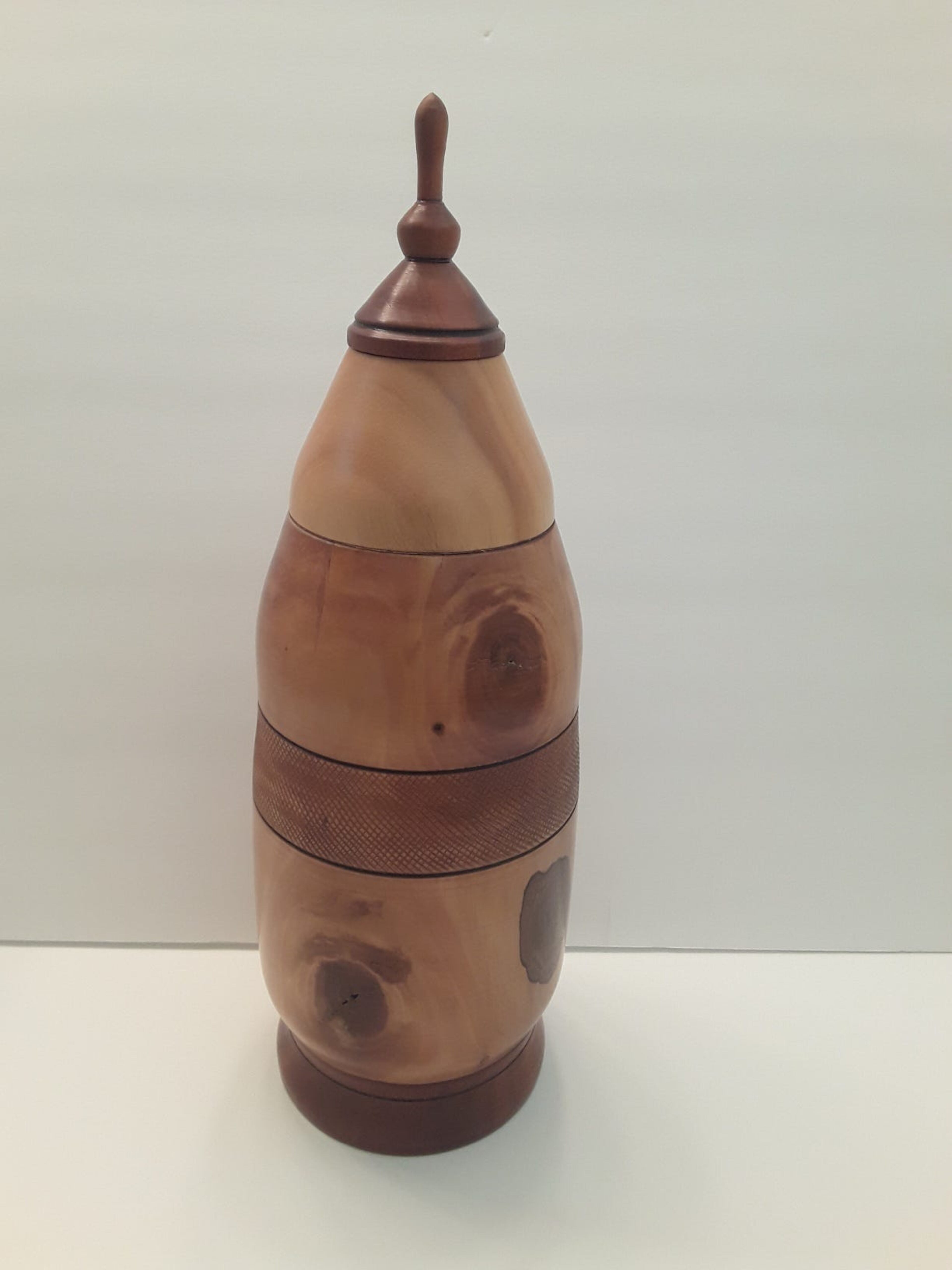 One standout is a rocket ship-shaped container comprised of six individually turned pieces seamlessly assembled. The top, when removed, reveals the empty space inside. Containers like these are hits with his grandchildren and adults who enjoy a bit of whimsy in their lives.