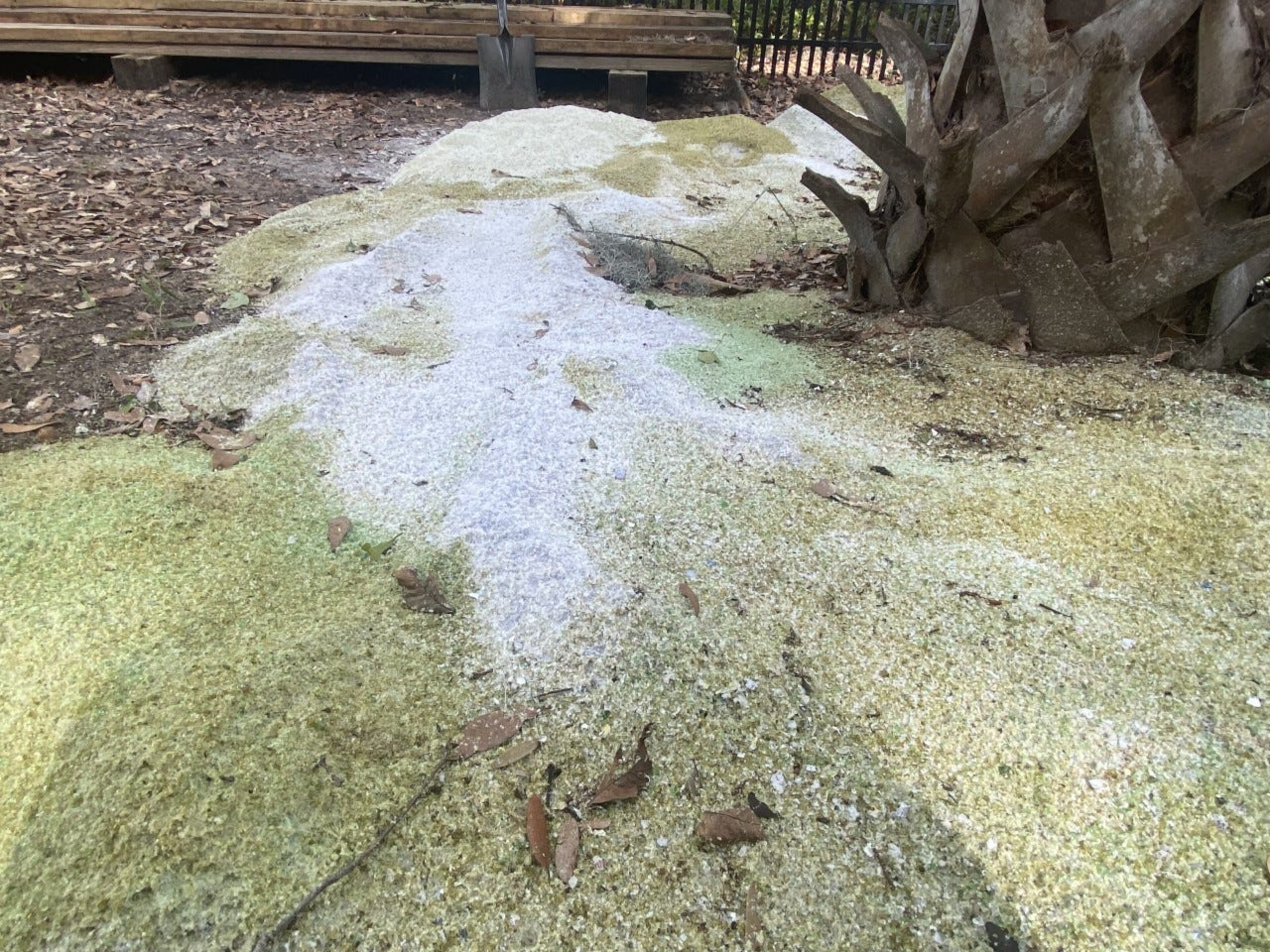 For now, she piles the sand around a tree in her backyard. Different colors of sand make tiny hills where she has experimented getting finer quality sand, grinding only certain colors to make a green or blue sand, or sand that has little bits of labels she didn’t peel off. It’s soft to the touch.