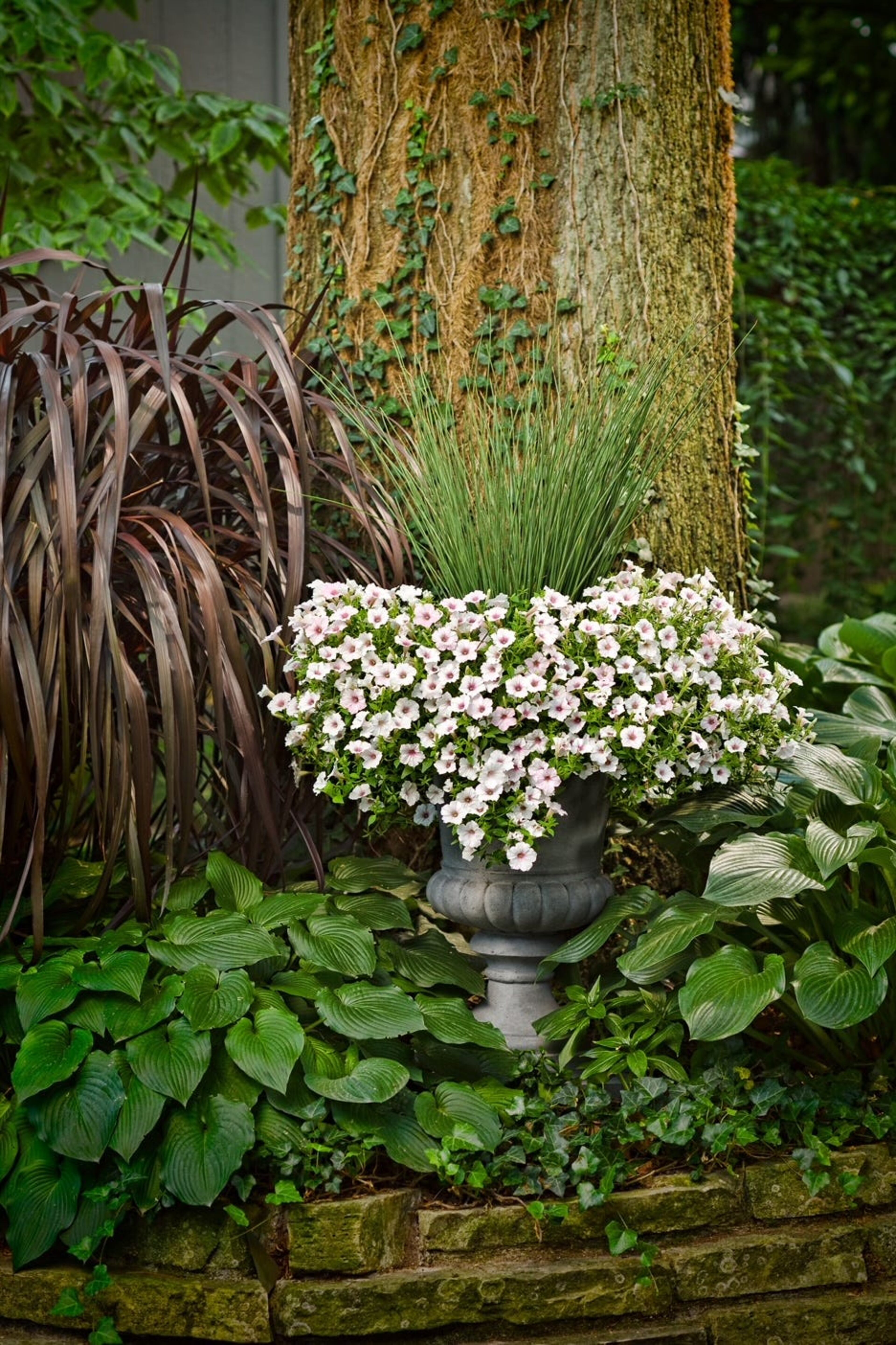 Consider the fairly new recipe called Misty Seas, this was also seen at Young’s Plant Farm. It features Supertunia Mini Vista Indigo, Supertunia Mini Vista Violet Star and Supertunia Mini Vista White, all award winners - and as you might guess, surrounding the Blue Mohawk. This could be the perfect choice for your porch, patio or deck.
