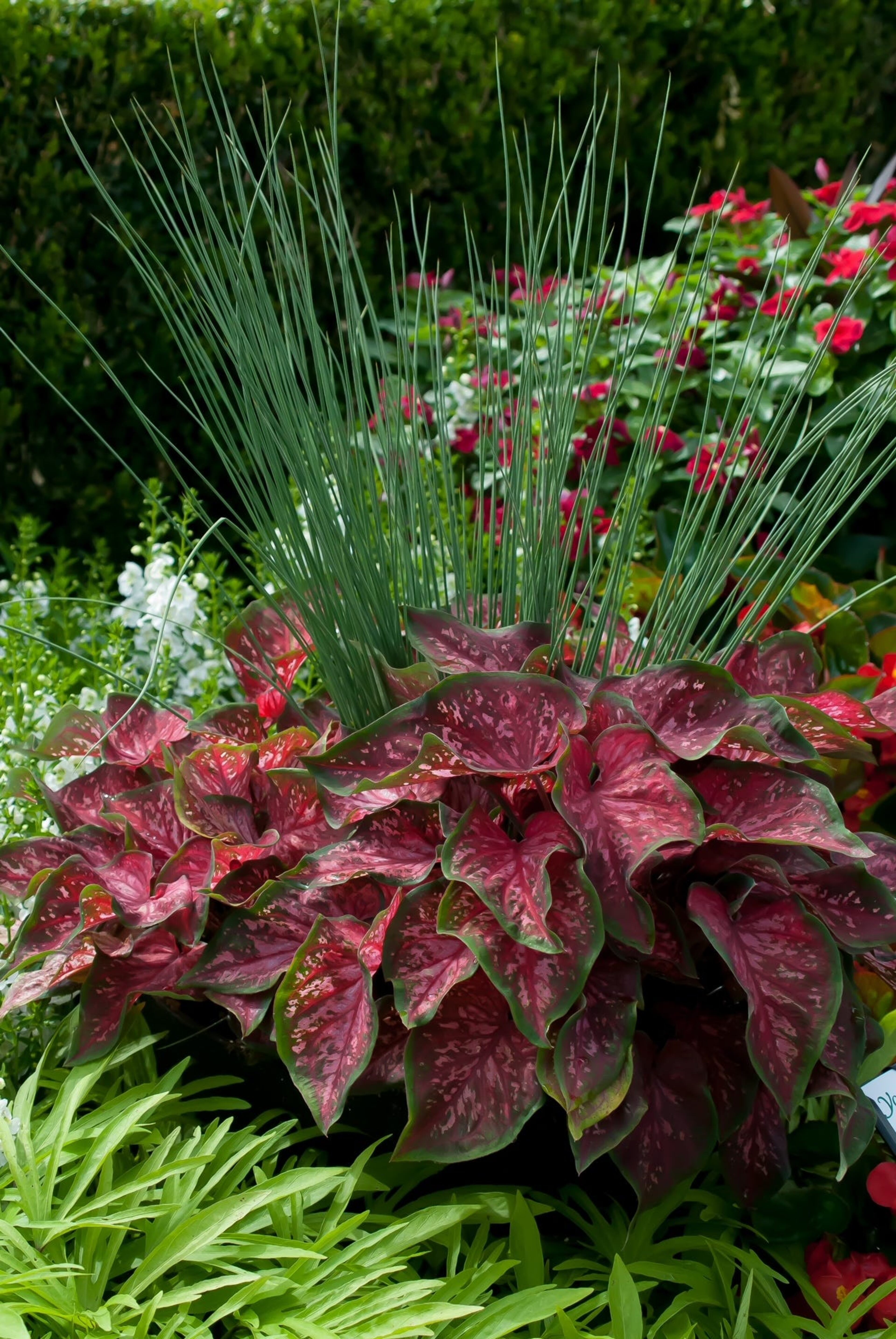 This was the case June 7 when Blue Mohawk was standing so picturesque, surrounded by Heart to Heart Fast Flash caladiums and Sweet Caroline Medusa Green sweet potato. Sure, you are still invited to let Blue Mohawk solve landscape issues wherever they are needed but now Blue Mohawk has moved into the category of fine art.