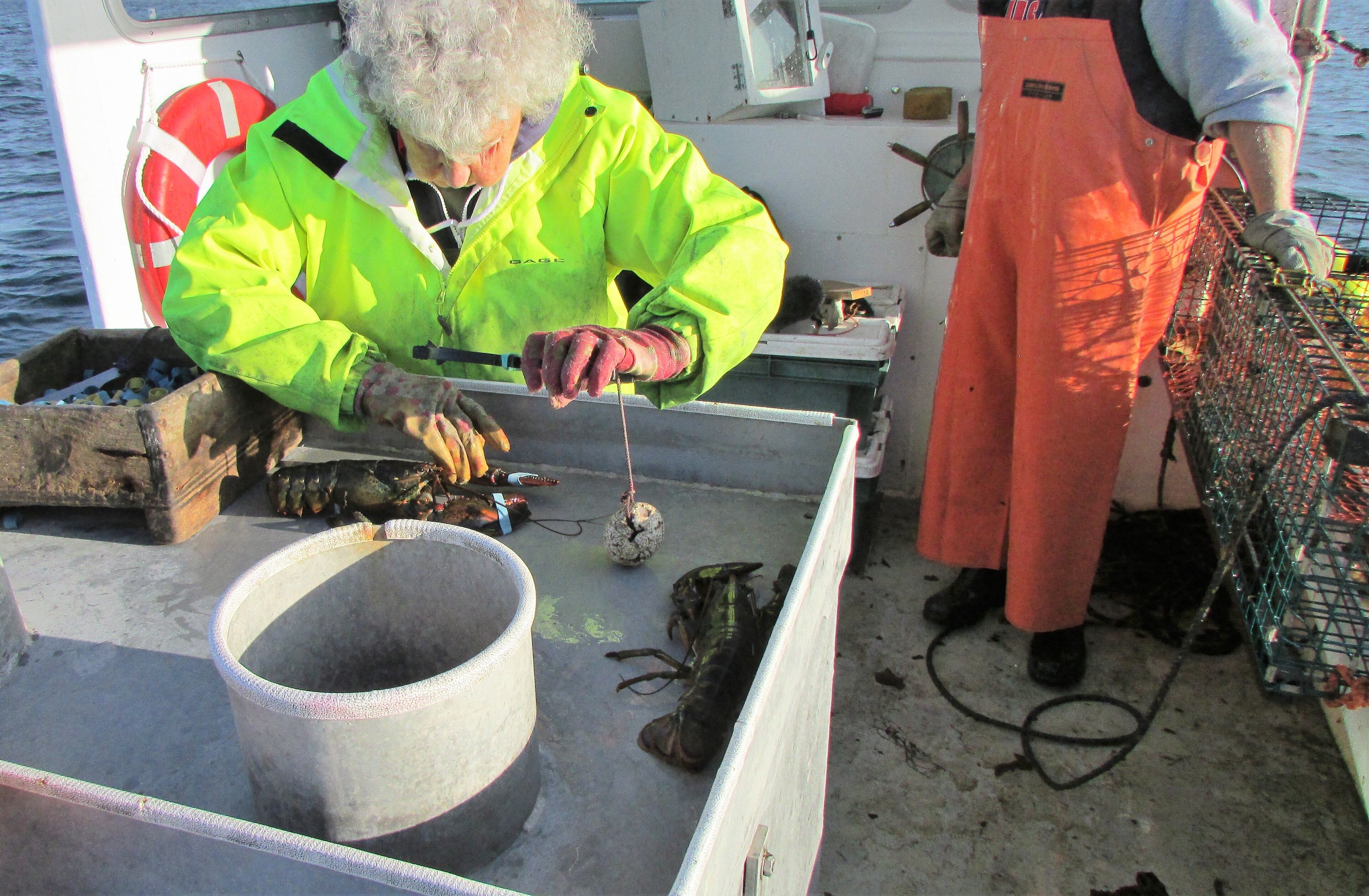 She measures the lobsters, bands the claws of the keepers, and puts them in the holding tanks. “We have separate tanks, and we get paid separately by the Spruce Head Co-op. Max pays for the boat maintenance. So, I do pretty good,” she winks.