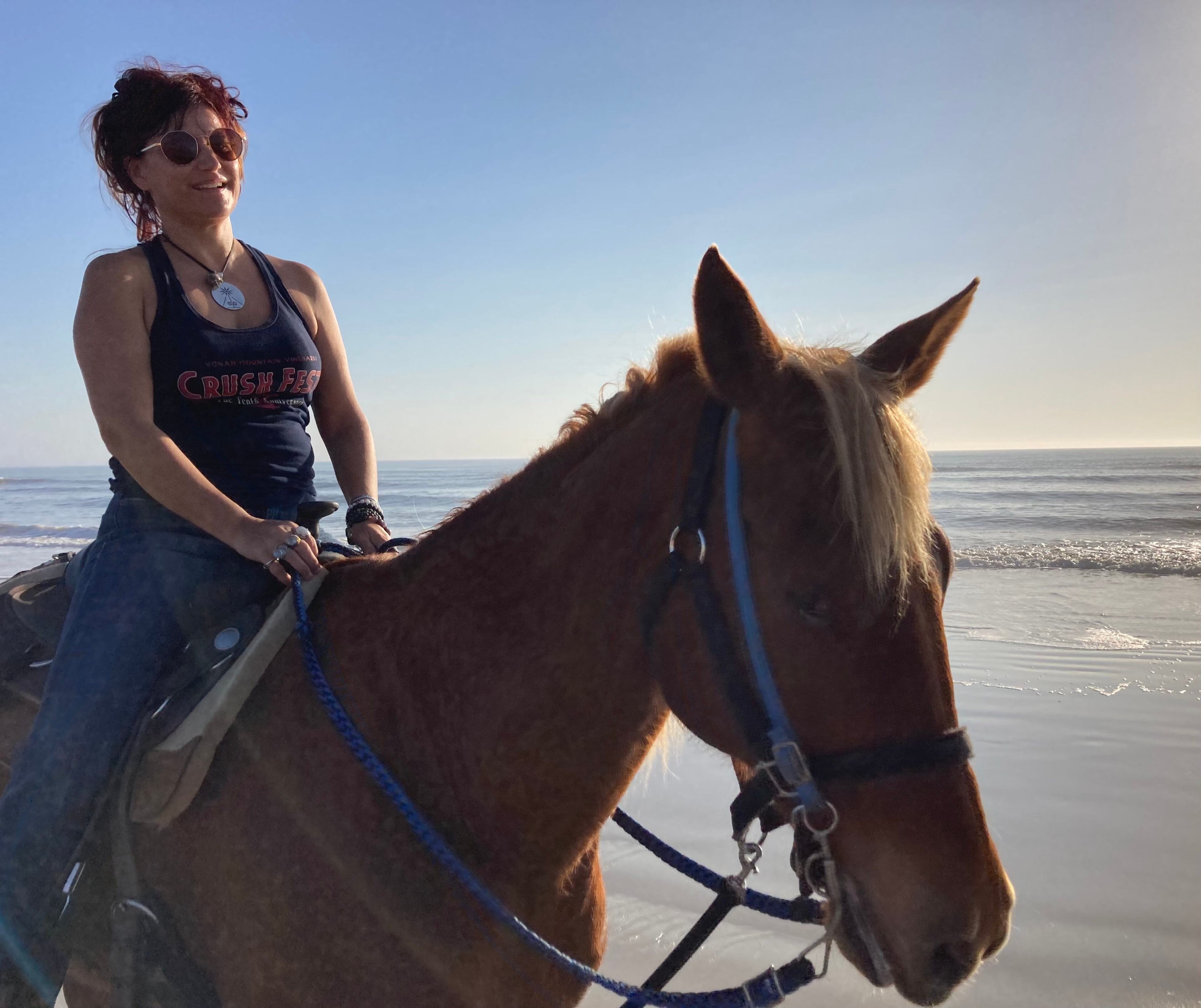 So, no epic moments of me and my horse flying over early morning sand — instead we splash at the ocean’s edge, the horses getting squirrely because they would really like to run. And there’s magic in that, feeling the power, and intention of a 1,200-pound animal at the shimmering brink of the Atlantic, no humans near.