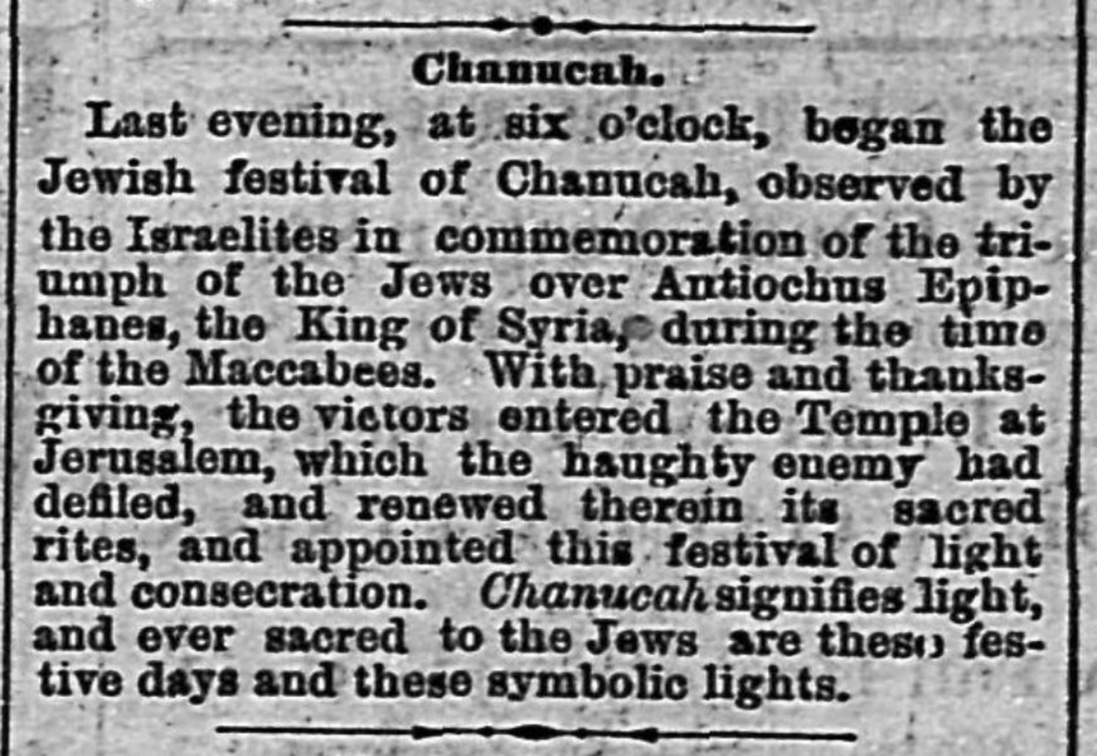 Hanukkah is most commonly celebrated at home with fried foods, songs, dreidel games, and of course lighting the menorah. In Savannah, one of the earliest mentions of Hannukah in the Savannah Morning News appeared in 1874.