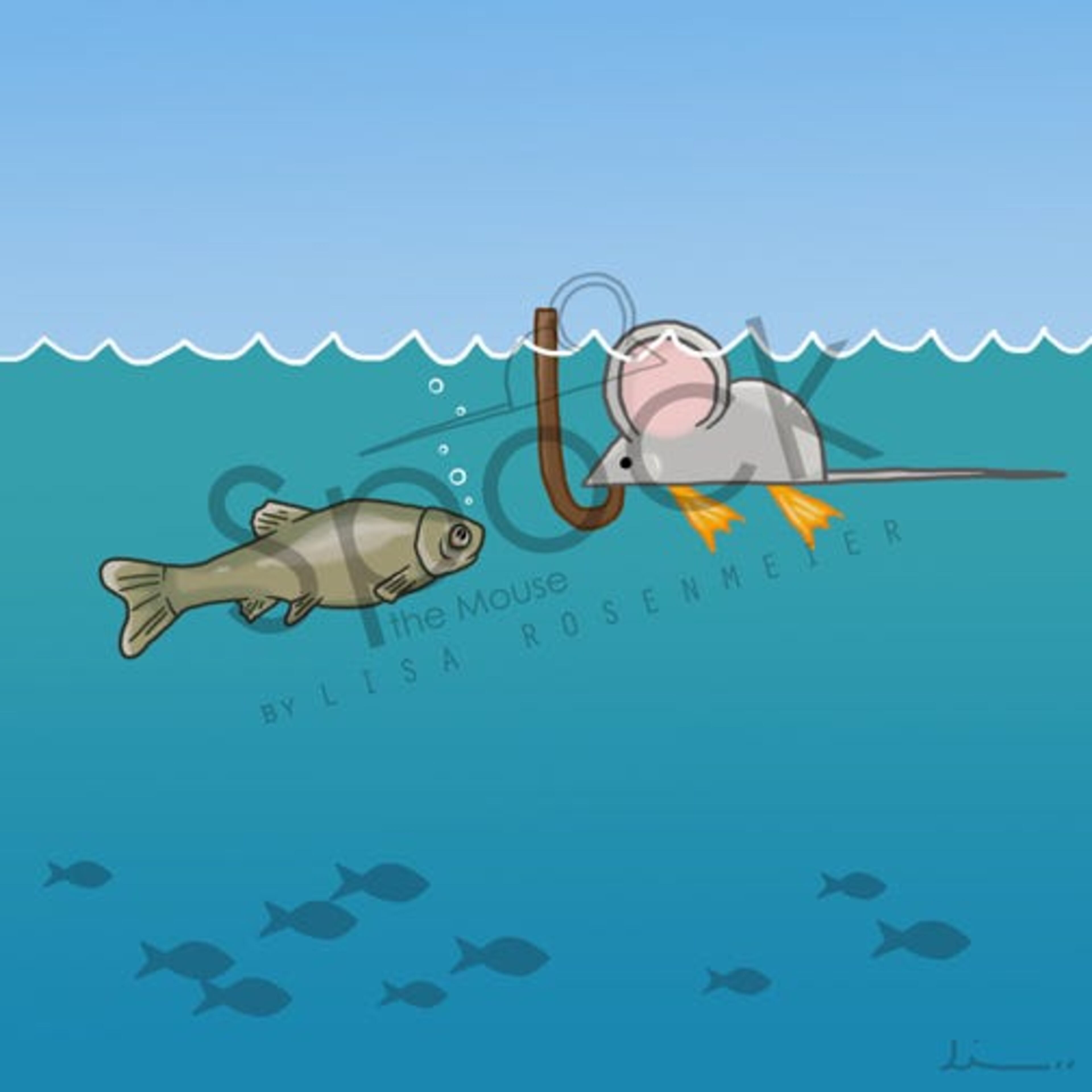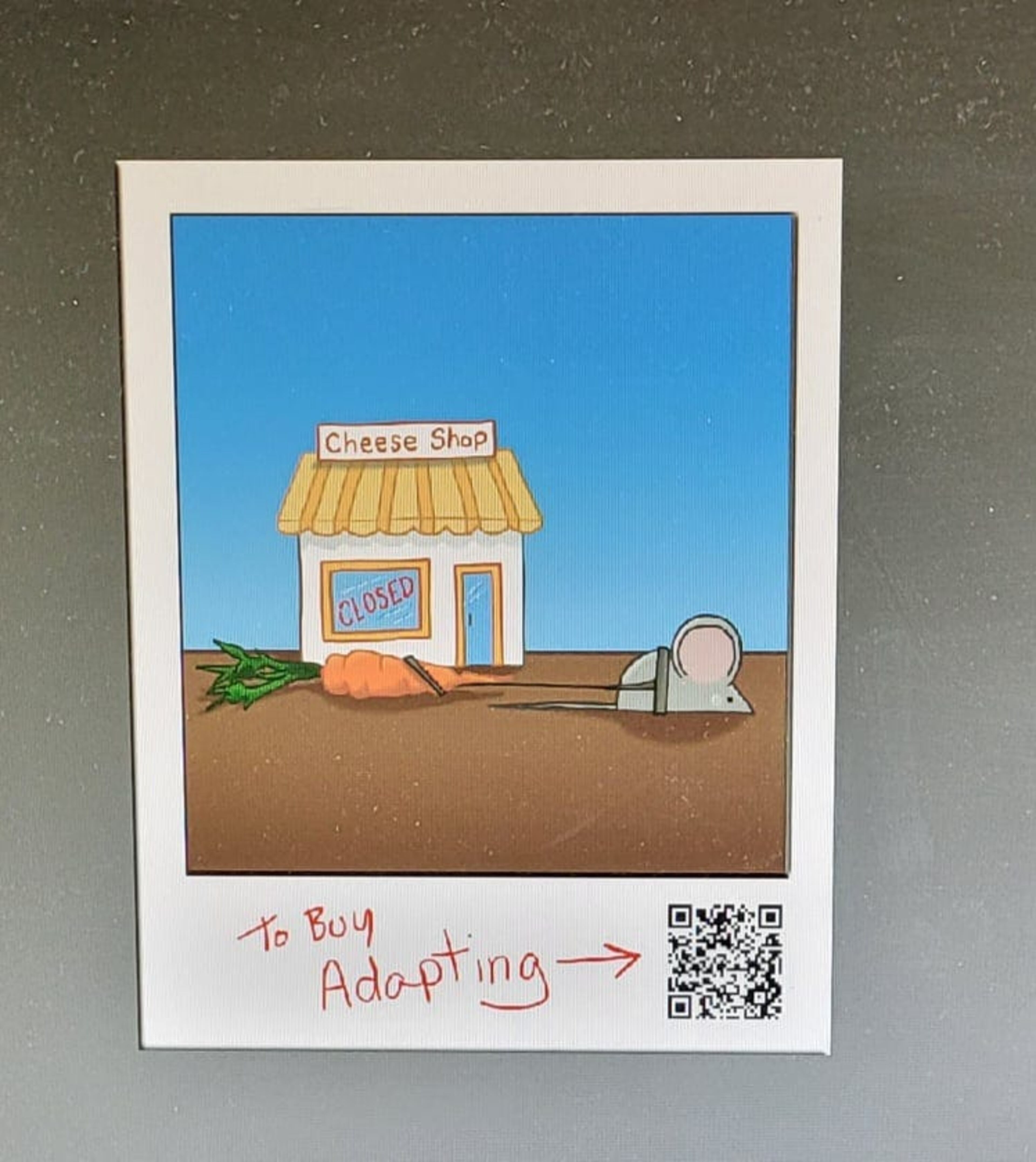 As poignant as the overarching reason behind the work may be, individually they’re delightful and hilarious rather than heavy, each one telling a bite-sized story of Spock navigating life as a little mouse in a big world. “Flirting with Danger,” for example, has the diminutive creature sneaking past a half-roused cat, while “Adapting” shows Spock forlornly dragging a carrot behind him as he passes a closed cheese shop.