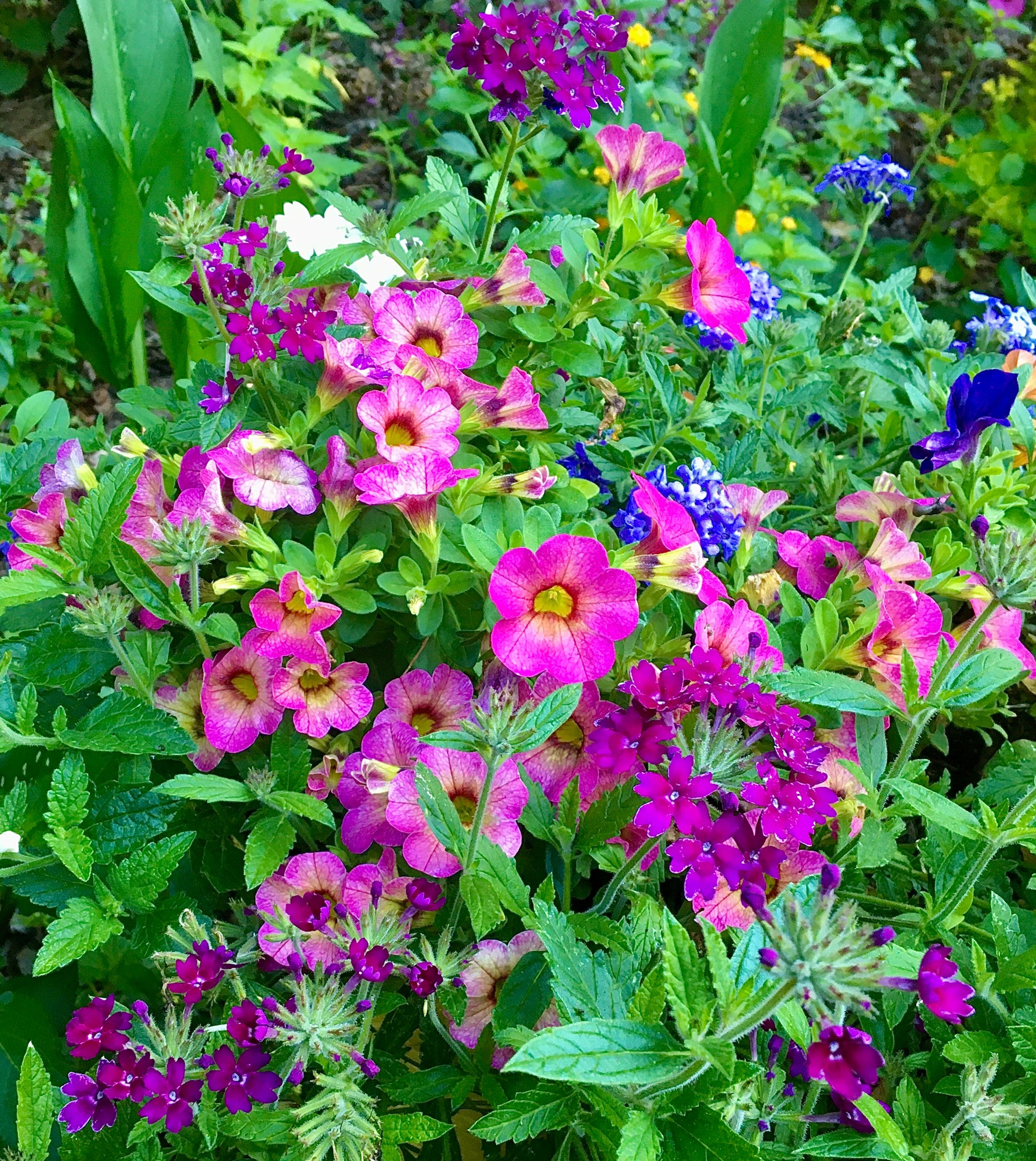 In another planter, I combined the heirloom look of Superbells Prism Pink Lemonade calibrachoa with Superbena Royale Plum Wine verbena which also has a certain nostalgic appeal. Then I spotted some blue with Superbena Royale Chambray verbena giving the planter a floral bouquet-like look. The one special trait you will love which was brought out in the Proven Winners official description is its ability to give you different looks during the day as the sun moves from east to west and perhaps a tree lends a few brief minutes of shifting shade.