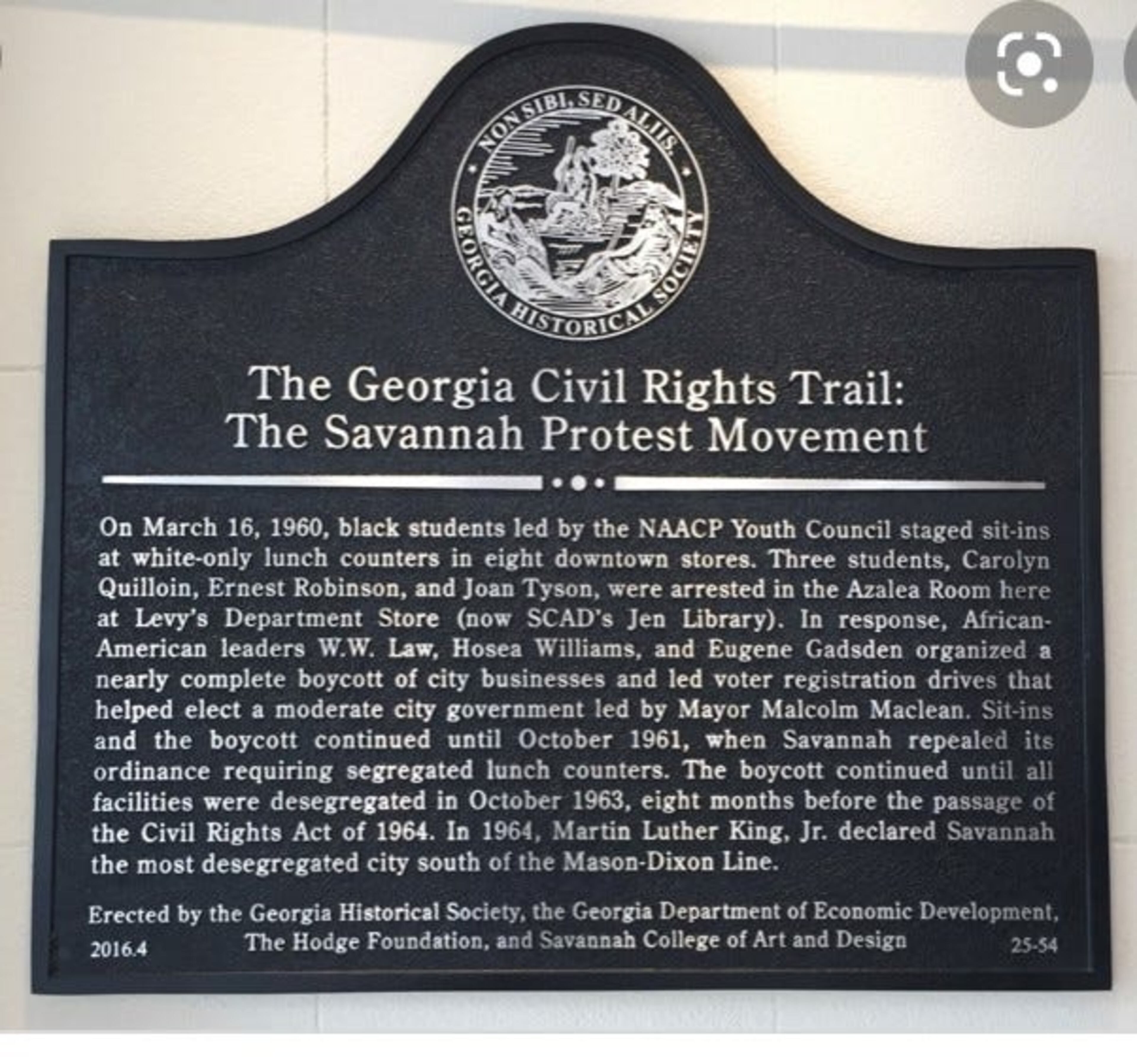 Currently, Chatham County is home to only one Civil Rights Trail marker, located at what is now the SCAD Jen Library on Broughton Street. The marker commemorates the many lunch counter sit-ins conducted on Broughton.