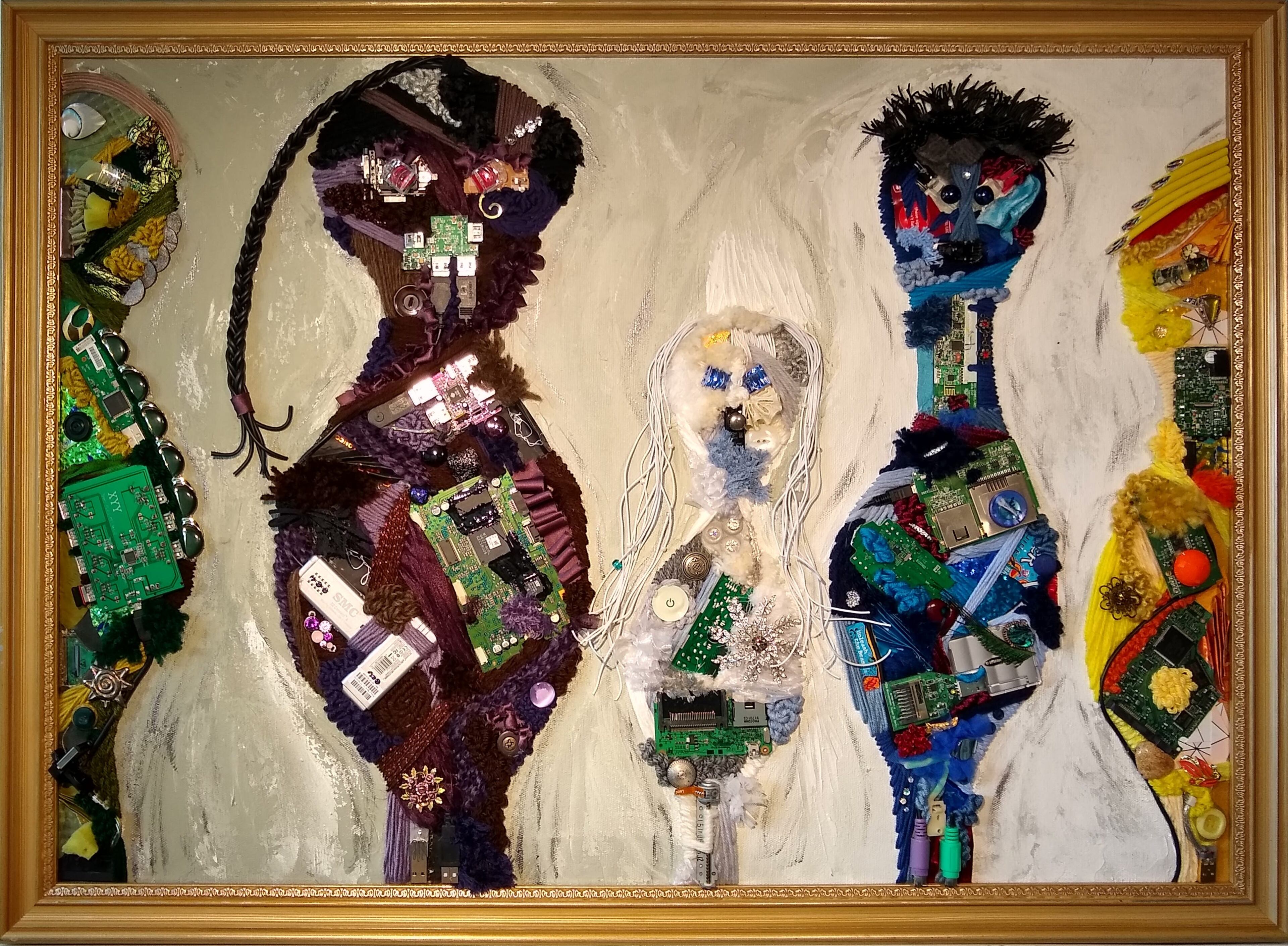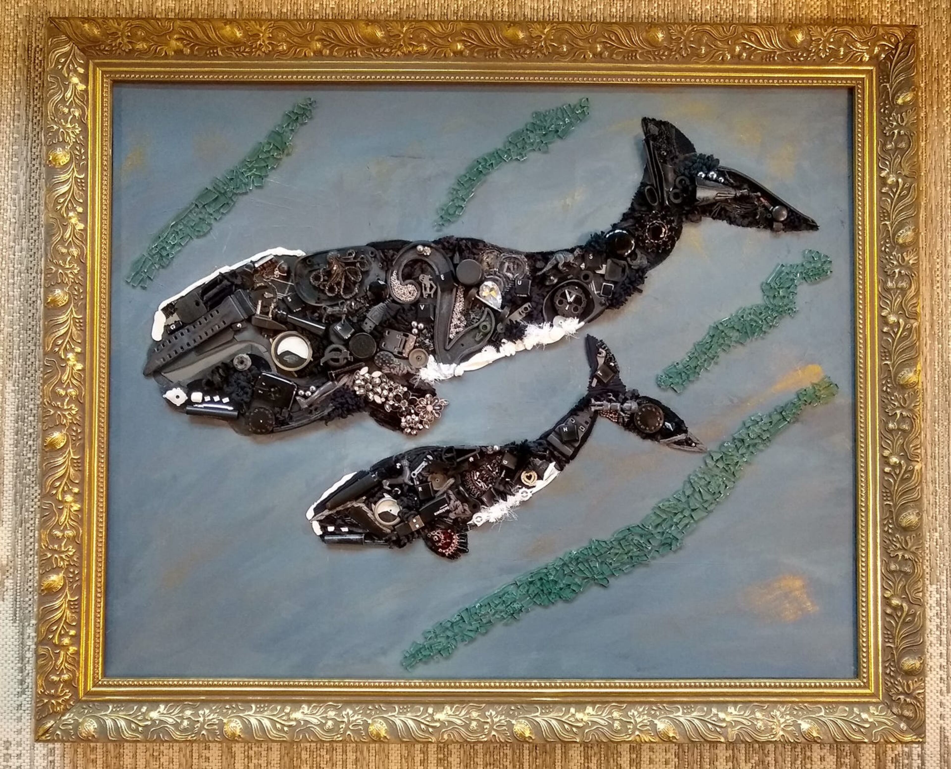 Miller has now collected a wide variety of objects that can potentially go into one of her compositions, from computer chips like the ones she utilized in the creation of the figurative piece “Homage to Femmes in Technology,” to plastic letters that spell out a hidden message in “Save Us Right Whales” one of several works in the show that feature animals or plants.