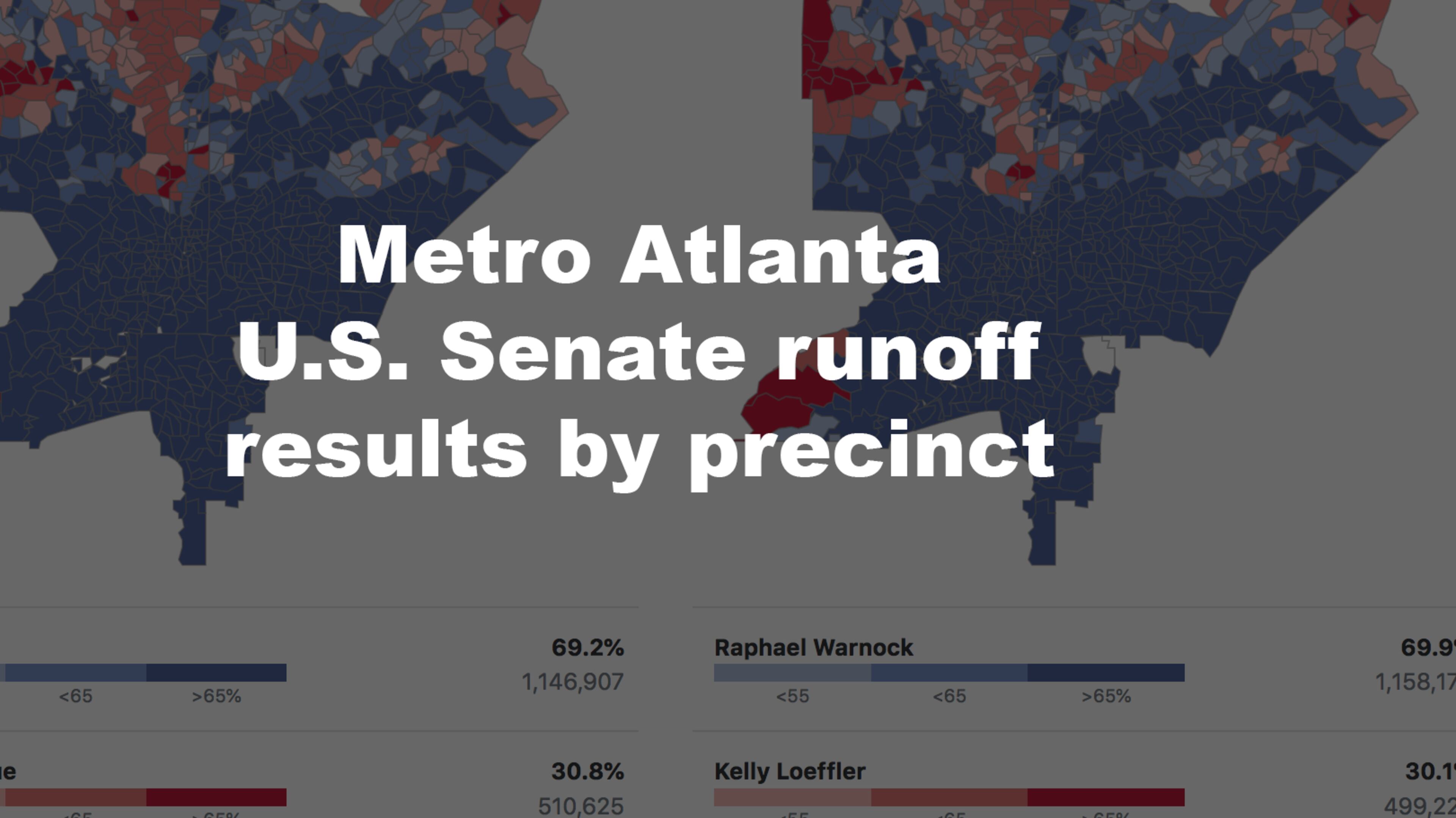 Explore how Metro Atlanta voted in Georgia's Jan. 5, 2021 U.S. Senate runoffs. Precincts are colored by the candidate who received the most votes. Tap a precinct for detailed results. County results maps | AJC election results | Latest election news