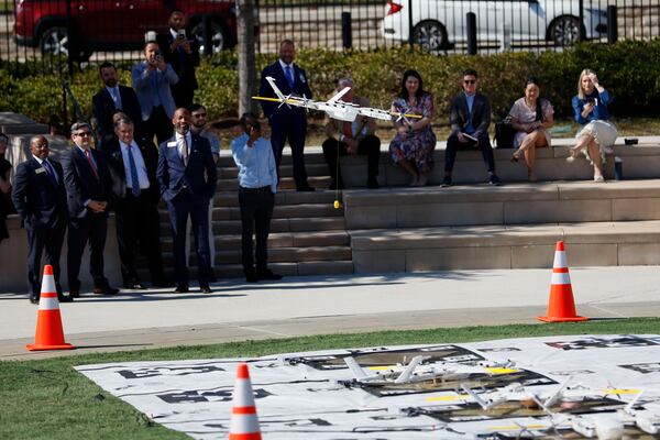 Georgia legislators watched as a buzzing drone descended from the air, hovering about 20 feet from the ground as it lowered its tether and unclipped a small container with a can of Coke inside.