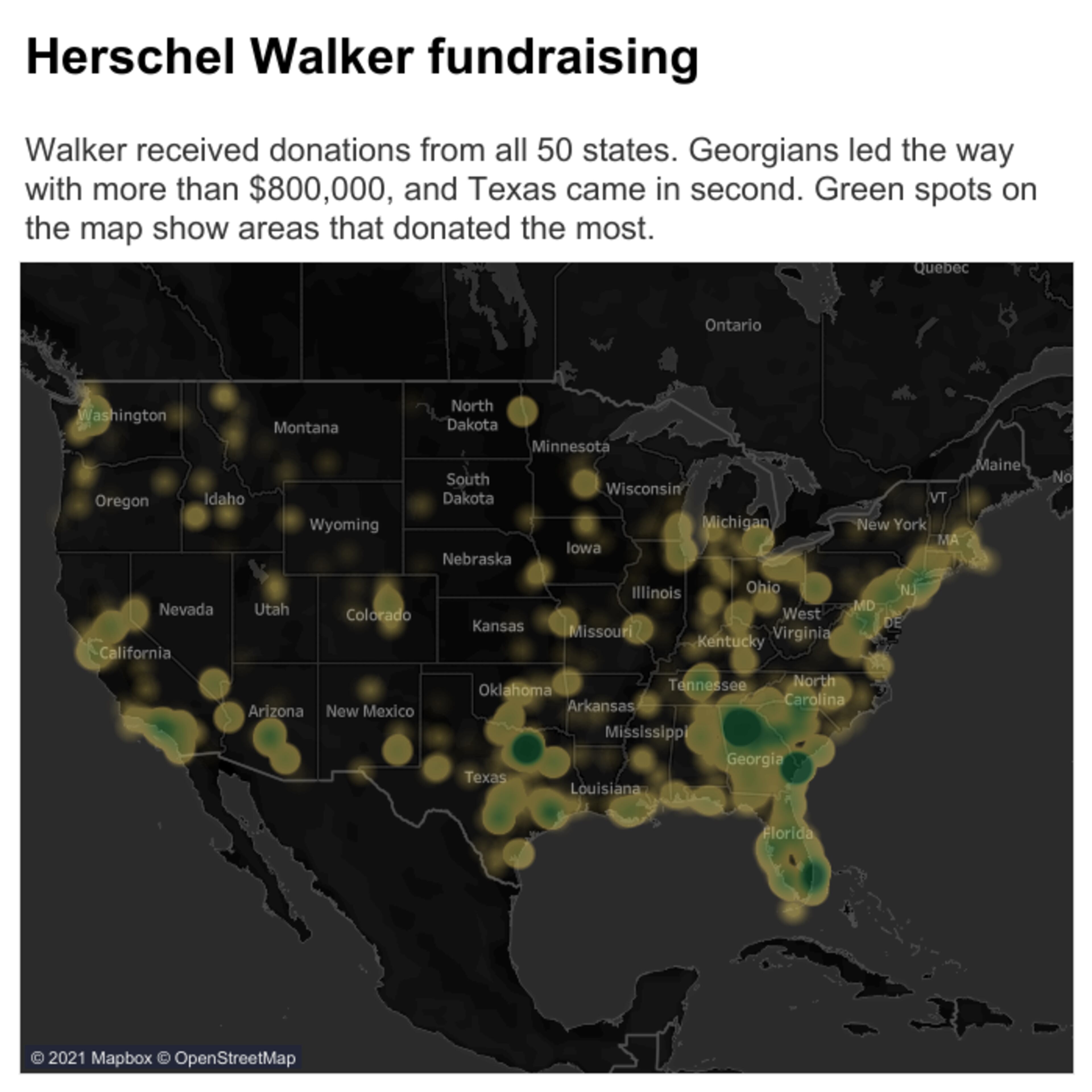 Walker, a former football star running for office with former President Donald Trump’s blessing, raised more than half of his itemized donations — generally, contributions of more than $200 — from outside of Georgia since he moved here from Texas in August and entered the race.