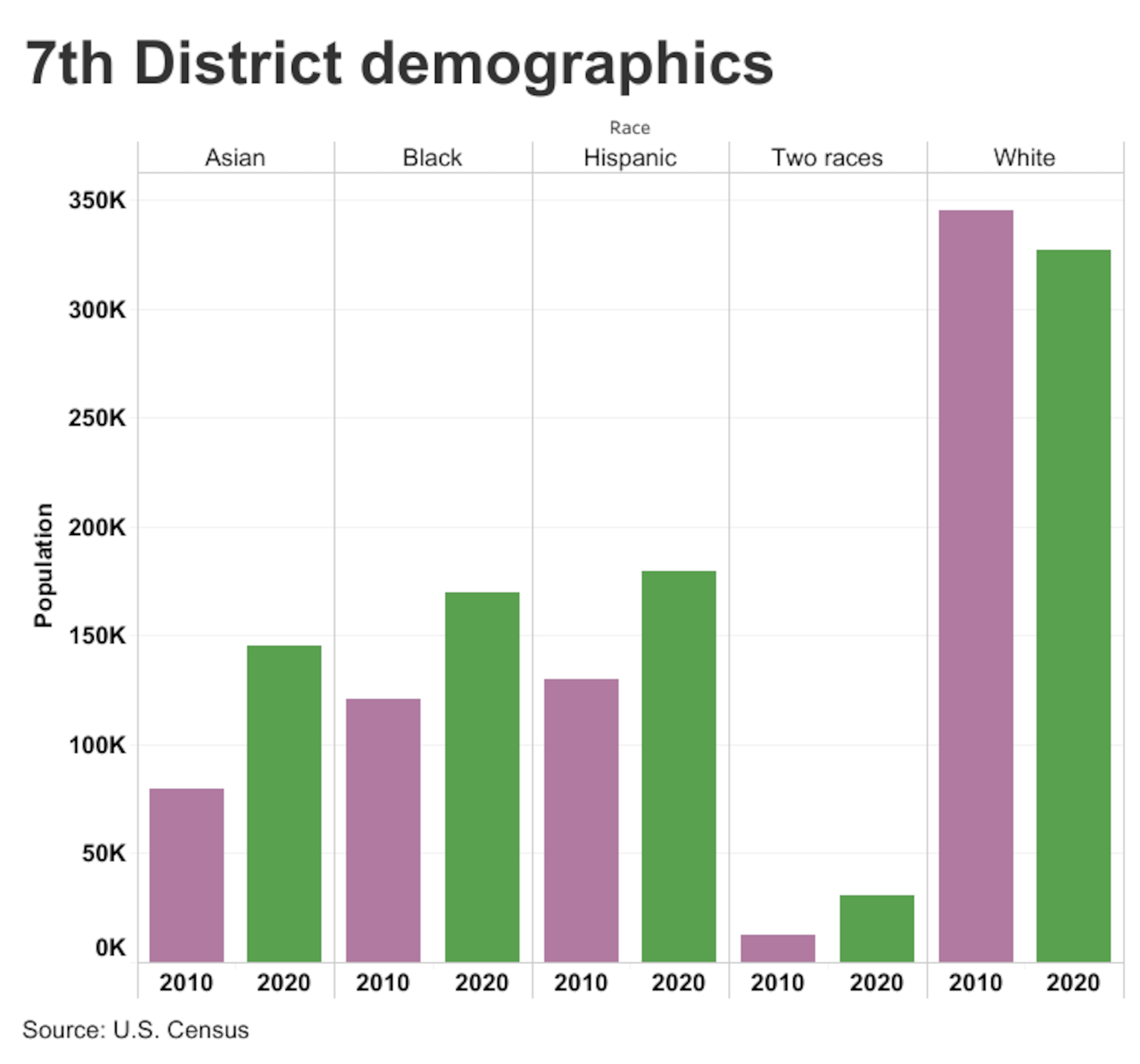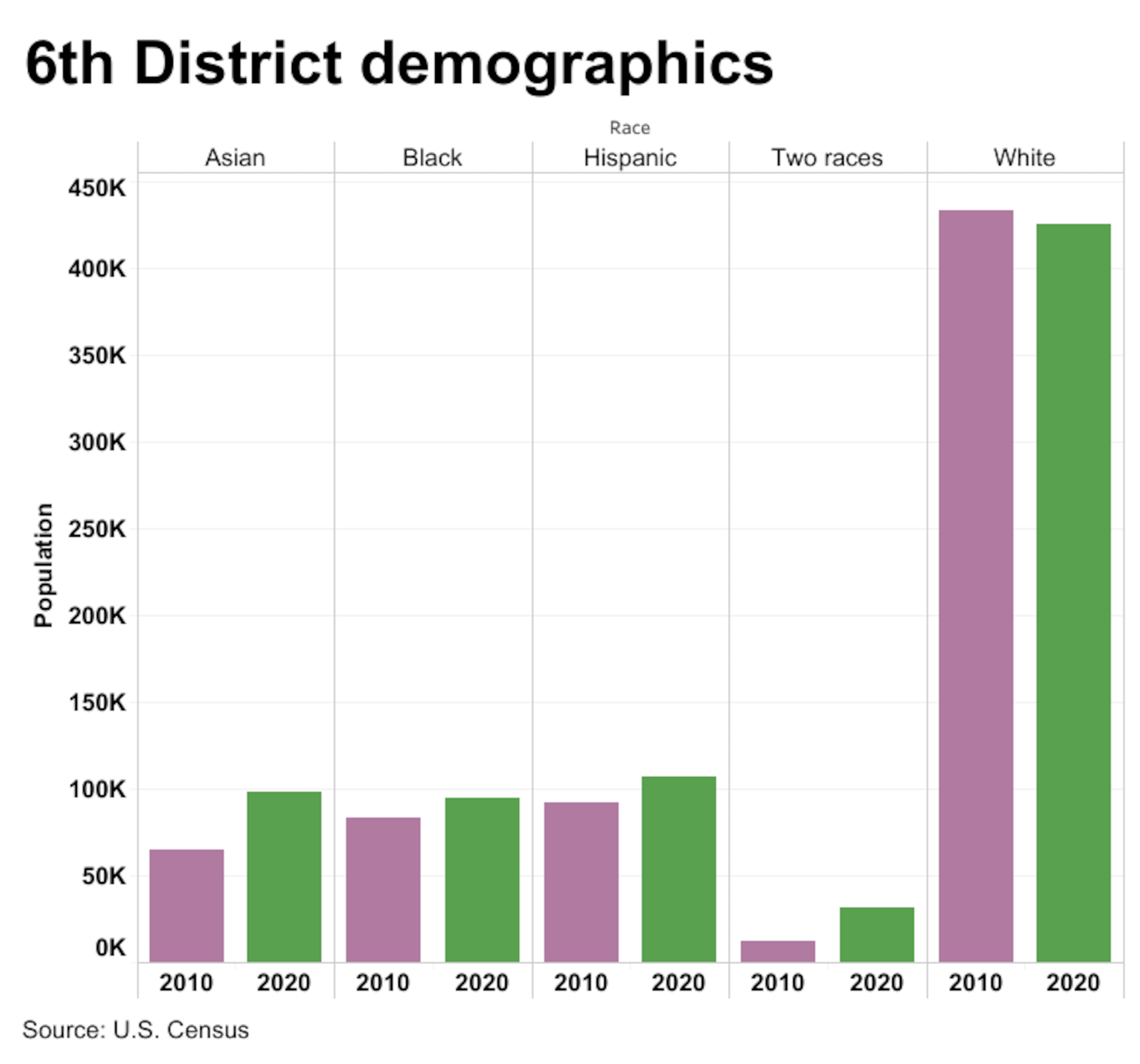 The districts’ political shift was driven by population growth during the past decade among groups that tend to favor Democratic candidates. The number of Black residents jumped by 41% in the 7th District and 14% in the 6th District, while white populations in both districts declined, according to census data.