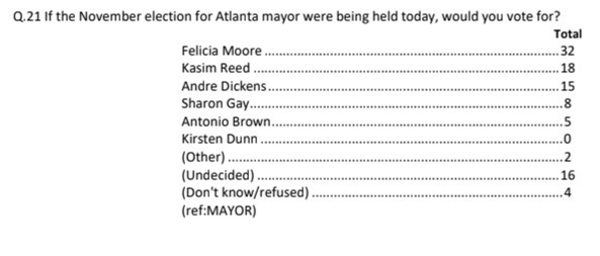 We got hold of an Atlanta mayoral poll commissioned by a conservative-leaning group that has City Council President Felicia Moore with a commanding lead at 32%, followed by former Atlanta Mayor Kasim Reed at 18% and Councilman Andre Dickens at 15%. About 20% of voters were either undecided or didn’t yet know.