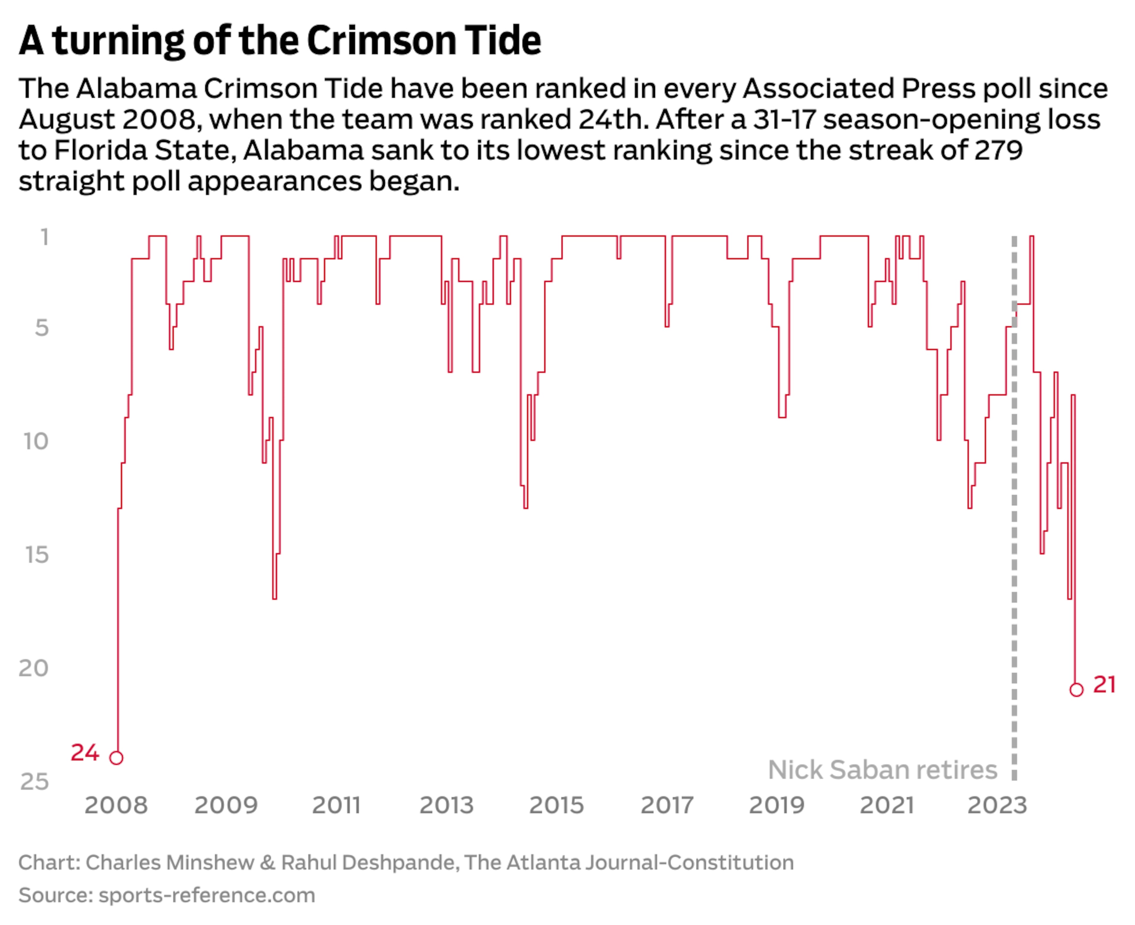 After getting manhandled by Florida State, Kalen DeBoer & Co. dropped all the way to No. 21 in the AP poll released Tuesday. Then the AJC data folks crunched the numbers — and, as it turns out, that’s the lowest ranking for the Crimson Tide since 2008.