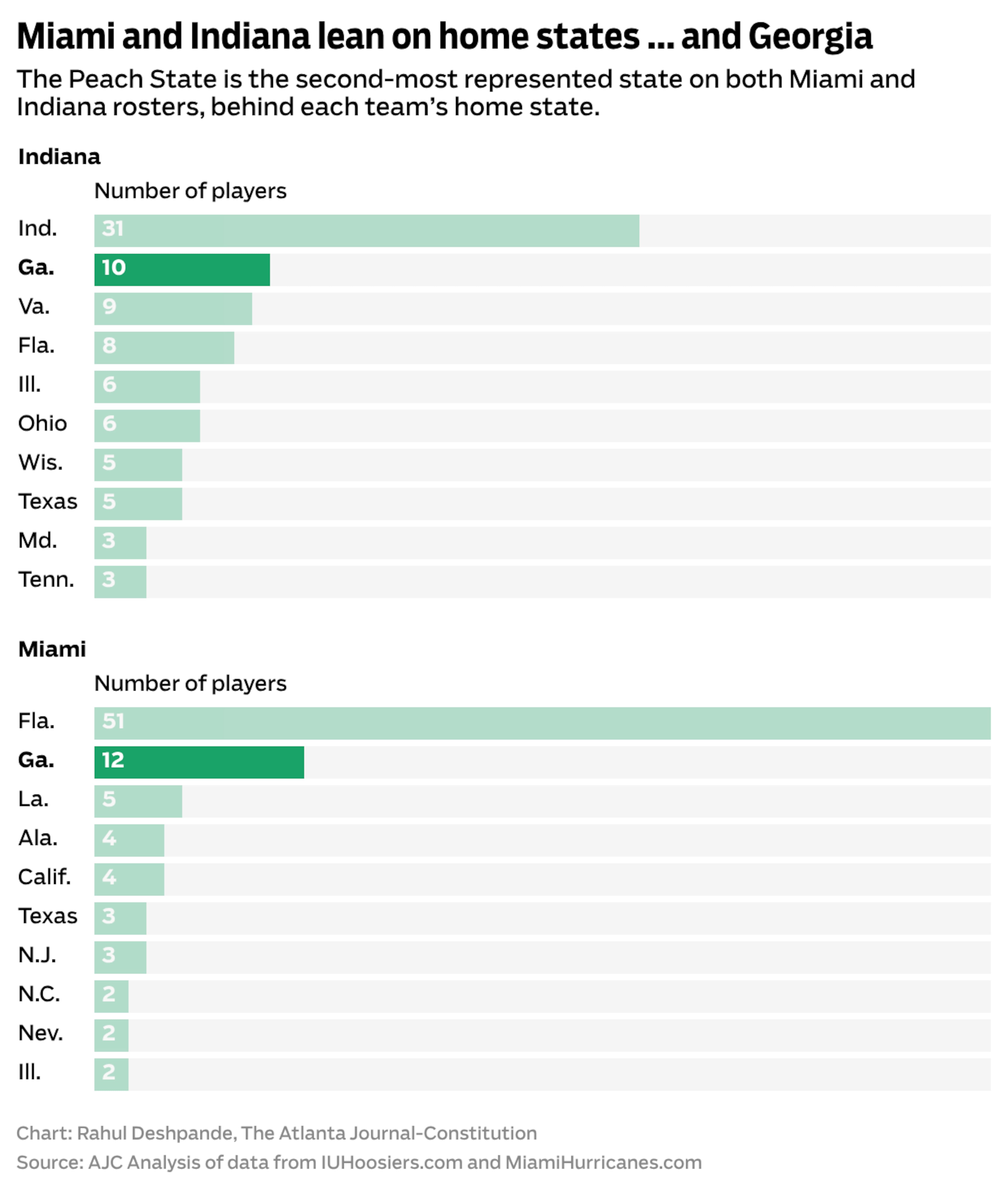 As you can see, our data buddy Rahul Deshpande found that 12 Miami players and 10 Indiana players suited up for a Georgia high school. Not shocking numbers, per se, but it does rank just below each CFP team’s home state, percentage wise.