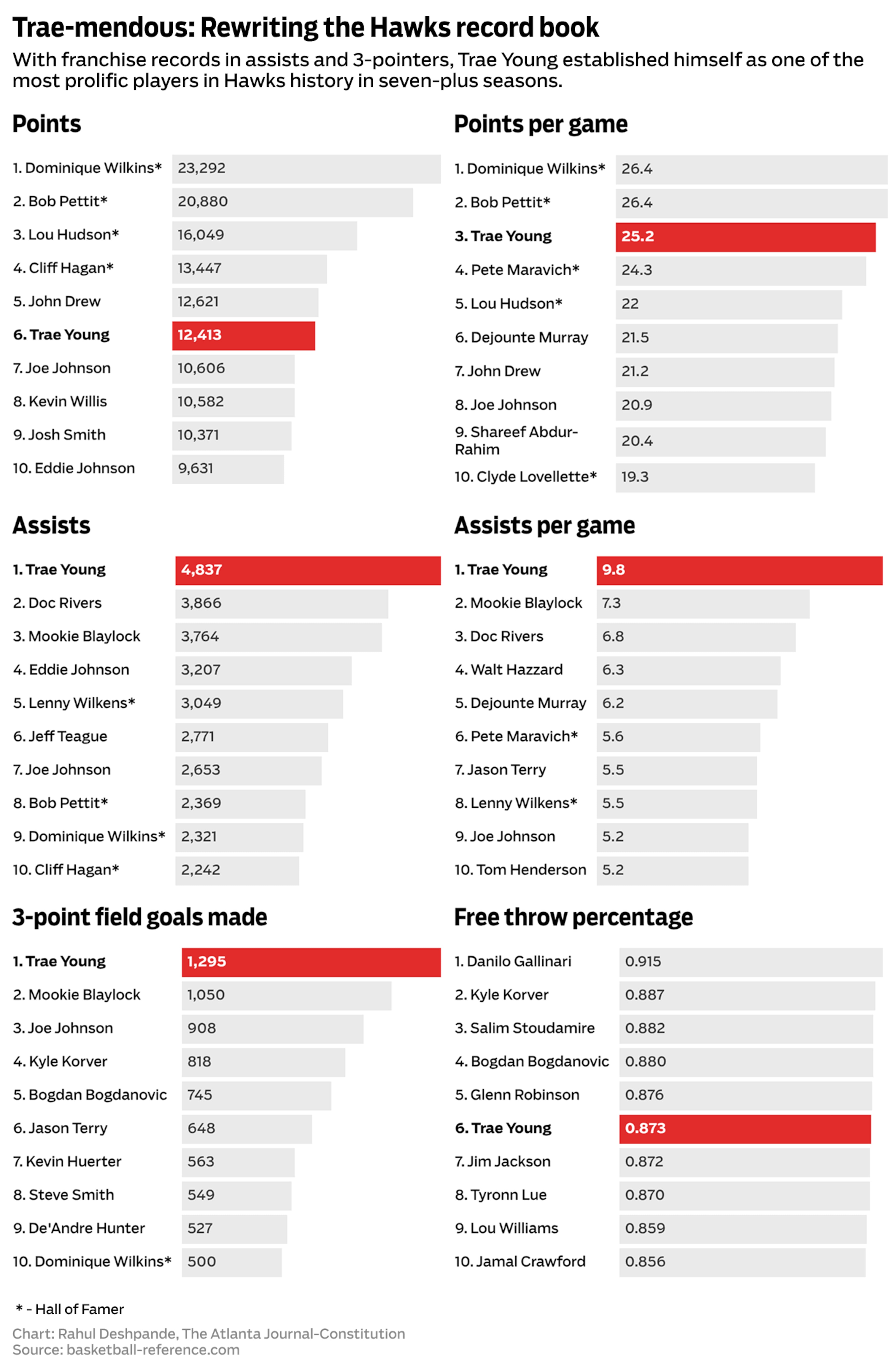 Young finishes his Hawks career with the franchise’s all-time marks in assists and made 3-pointers (by a lot). He’s third in points per game and sixth in total points — again, in less than eight seasons.