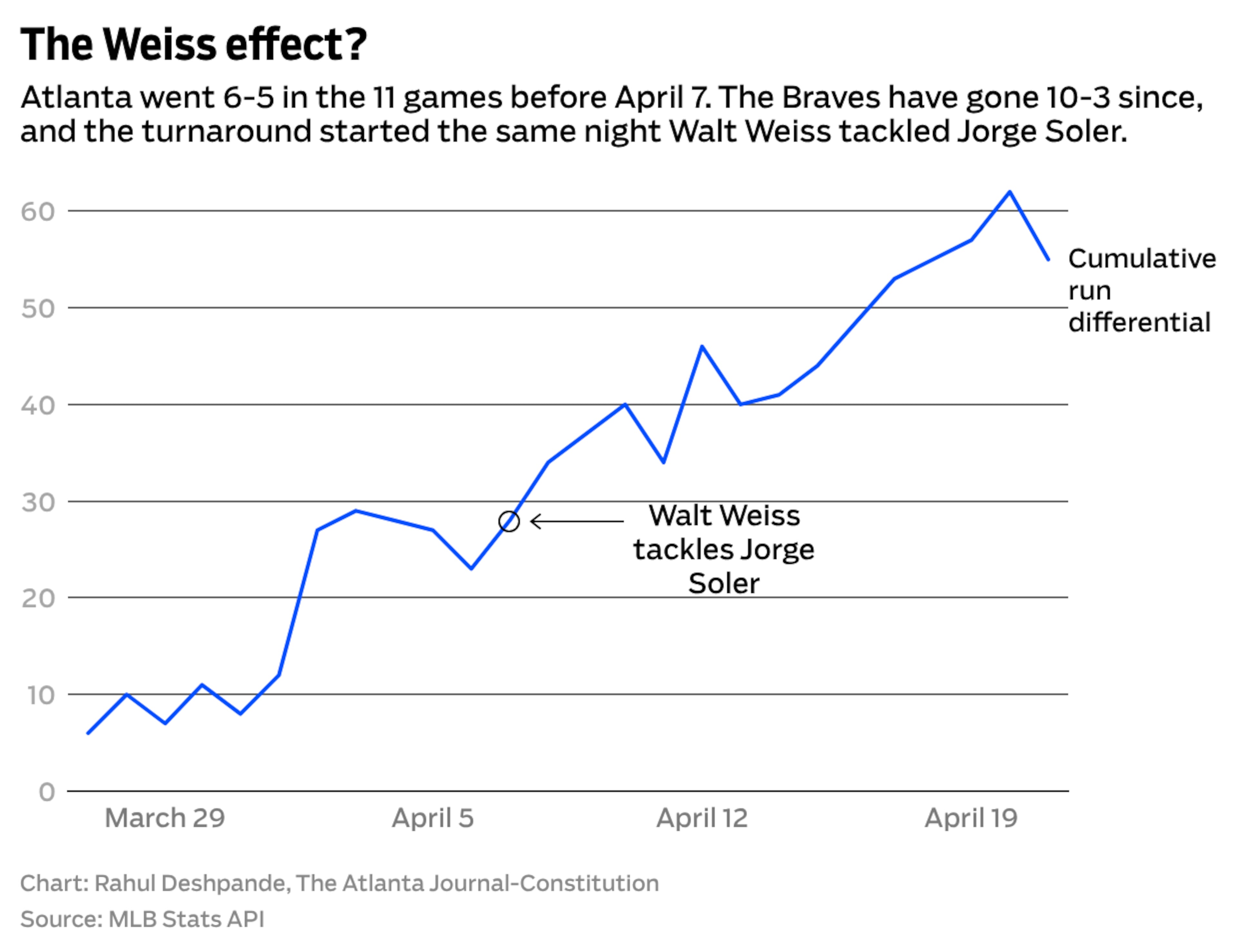 Prior to last night’s 11-4 loss in Washington, the Braves’ average post-tackle run differential sat at +3.25 per game — more than a full run better than before. And the big-name bats are starting to heat up, too.