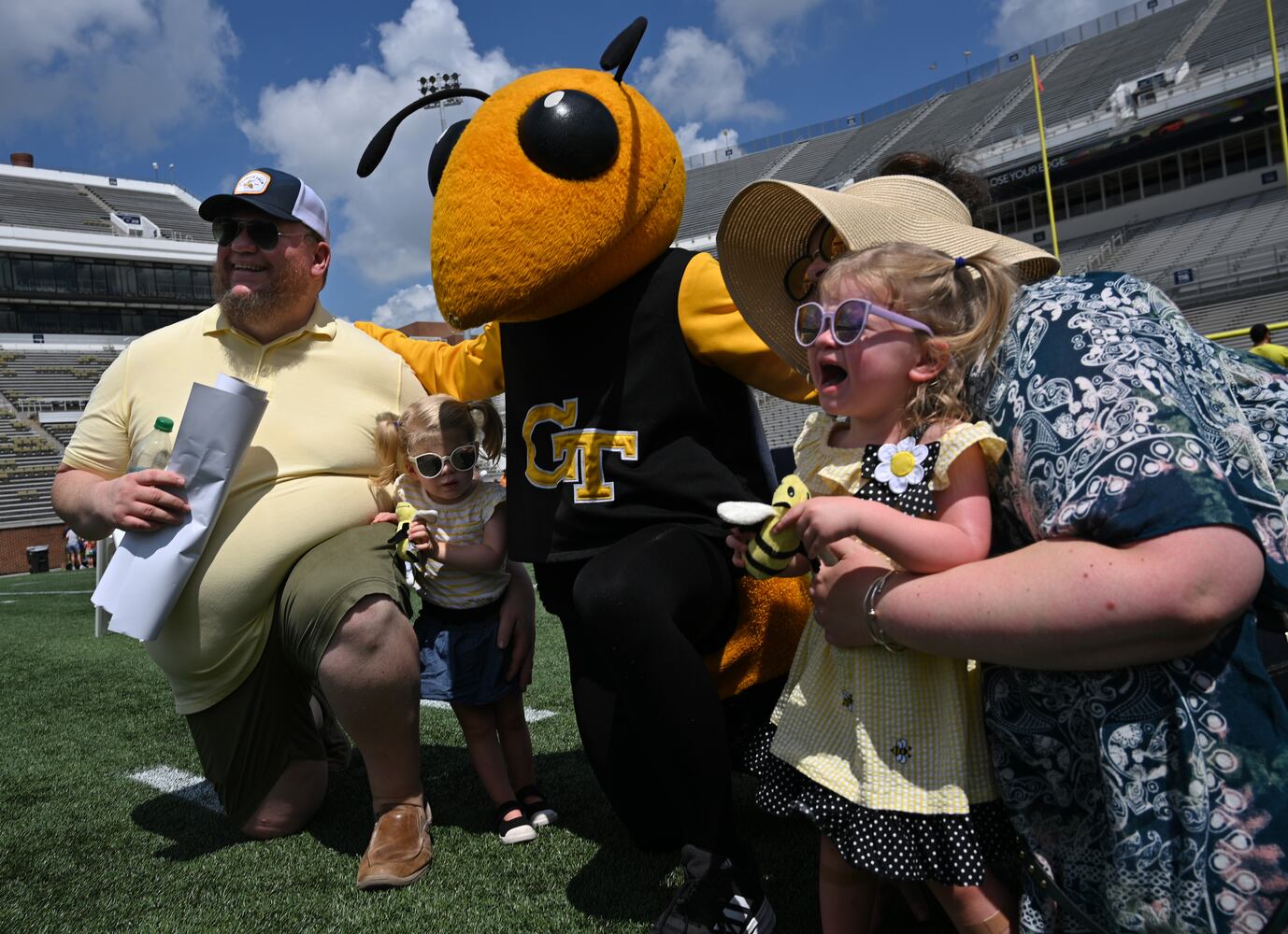 Nezzy Usry (right), 2, cries as she poses with Buzz during Georgia Tech football’s annual Fan Day. The event featured a plethora of interactive on-field activities for the whole family, including the opportunity to run out of the tunnel onto the field like the Yellow Jackets do on game day, a football toss, ladder drills, combine and tailgate games, an agility course, field goal kicking, a uniform station, 360-degree photo booth and more. (Hyosub Shin / Hyosub.Shin@ajc.com)