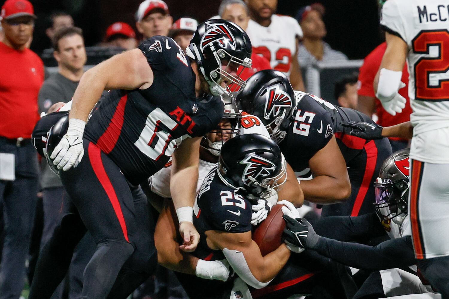 Wide receiver Drake London caught 10 of 11 targets for 172 yards. Tampa Bay’s Mike Evans was held to one catch for 8 yards.