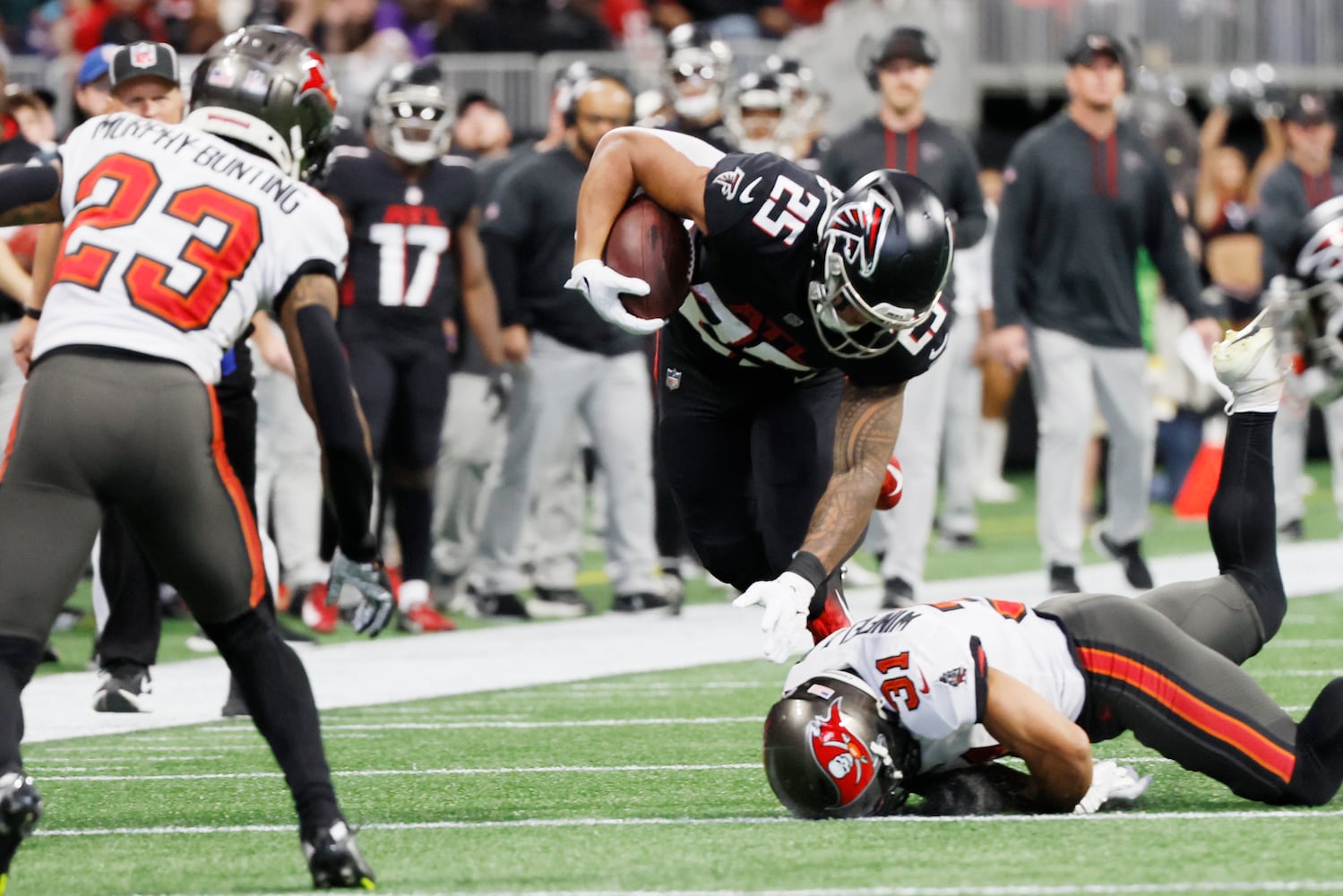 Running back Tyler Allgeier set a rookie rushing record with 1,035 yards for the season. The old mark of 1,023 was set by William Andrews in 1979. Allgeier, a fifth-round pick from BYU, rushed 24 times for 135 yards.