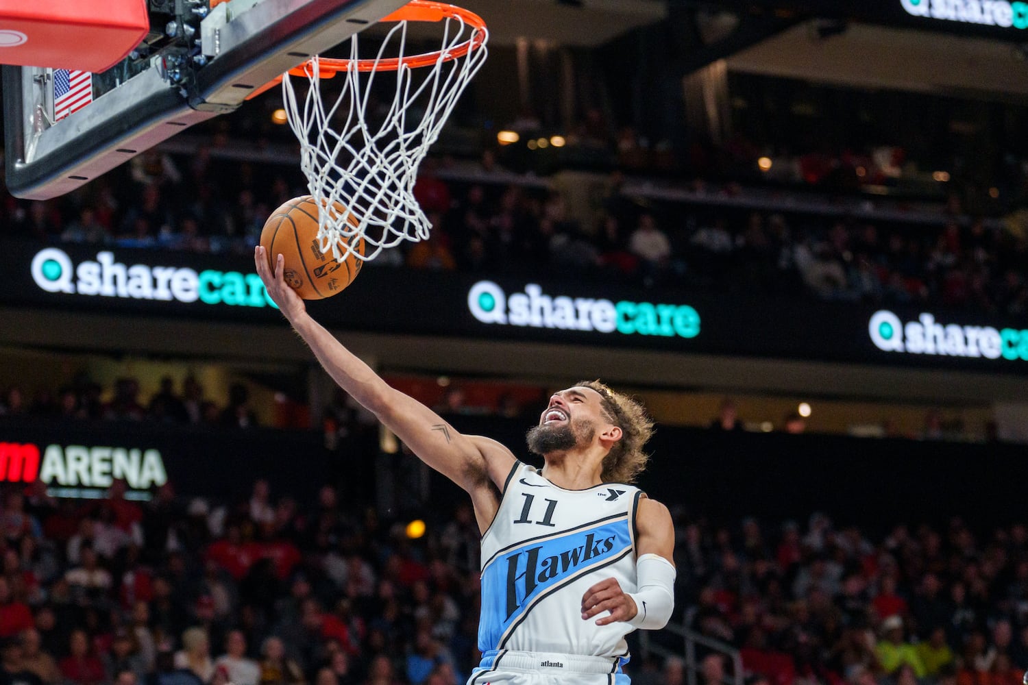 He knocked down a 3, which drew a shout of “Save us Larry” from the Hawks FanDuel 404 Crew. He then made a running layup then hit another 3 from the corner, before finishing his scoring punch with a dunk after setting a pick for Young.