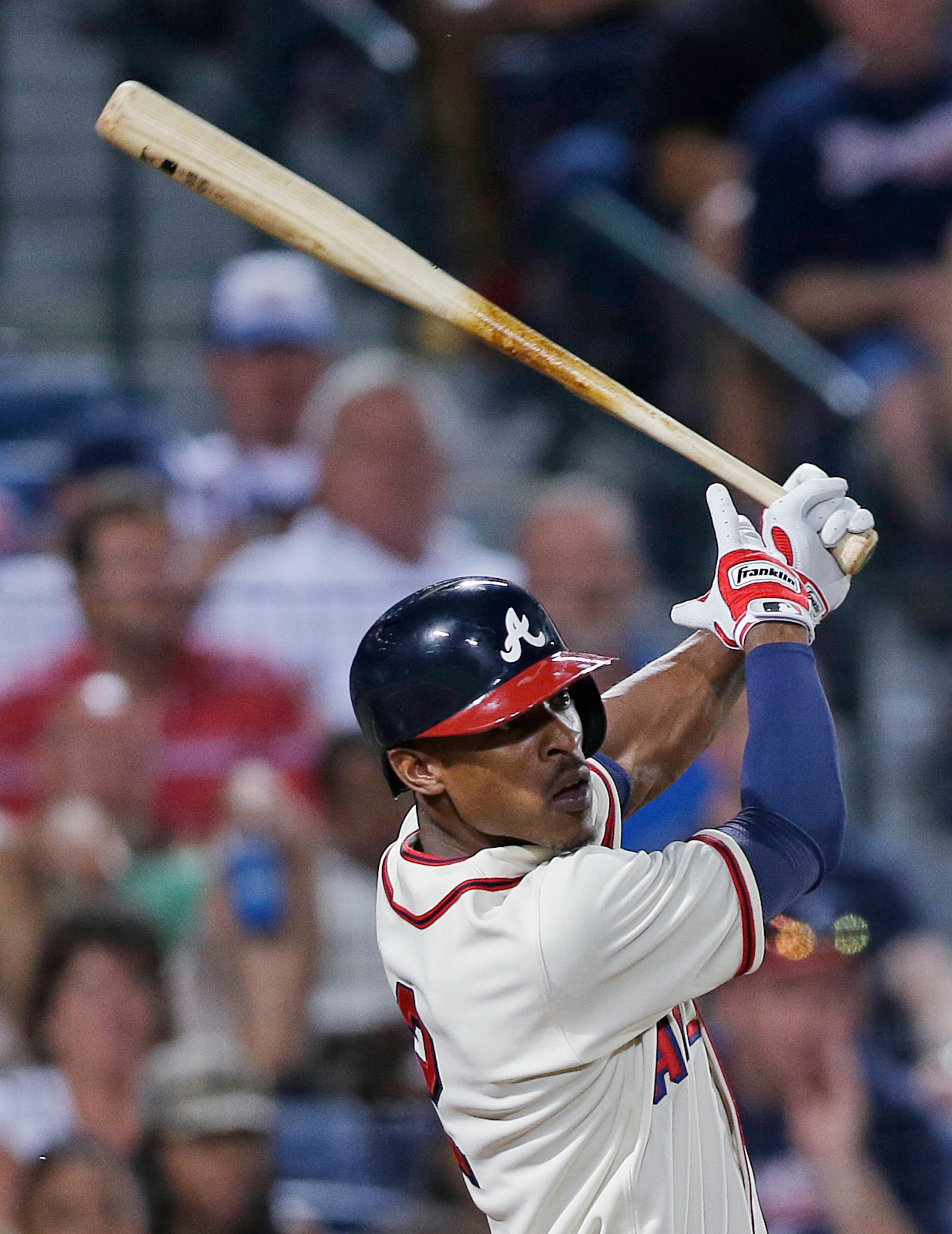 Atlanta Braves' B.J. Upton (2) celebrates after driving in the game-winning run with a base hit in the 10th inning of a baseball game against the Washington Nationals in Atlanta, Saturday, June 1, 2013. Atlanta won 3-2. (AP Photo/John Bazemore)
