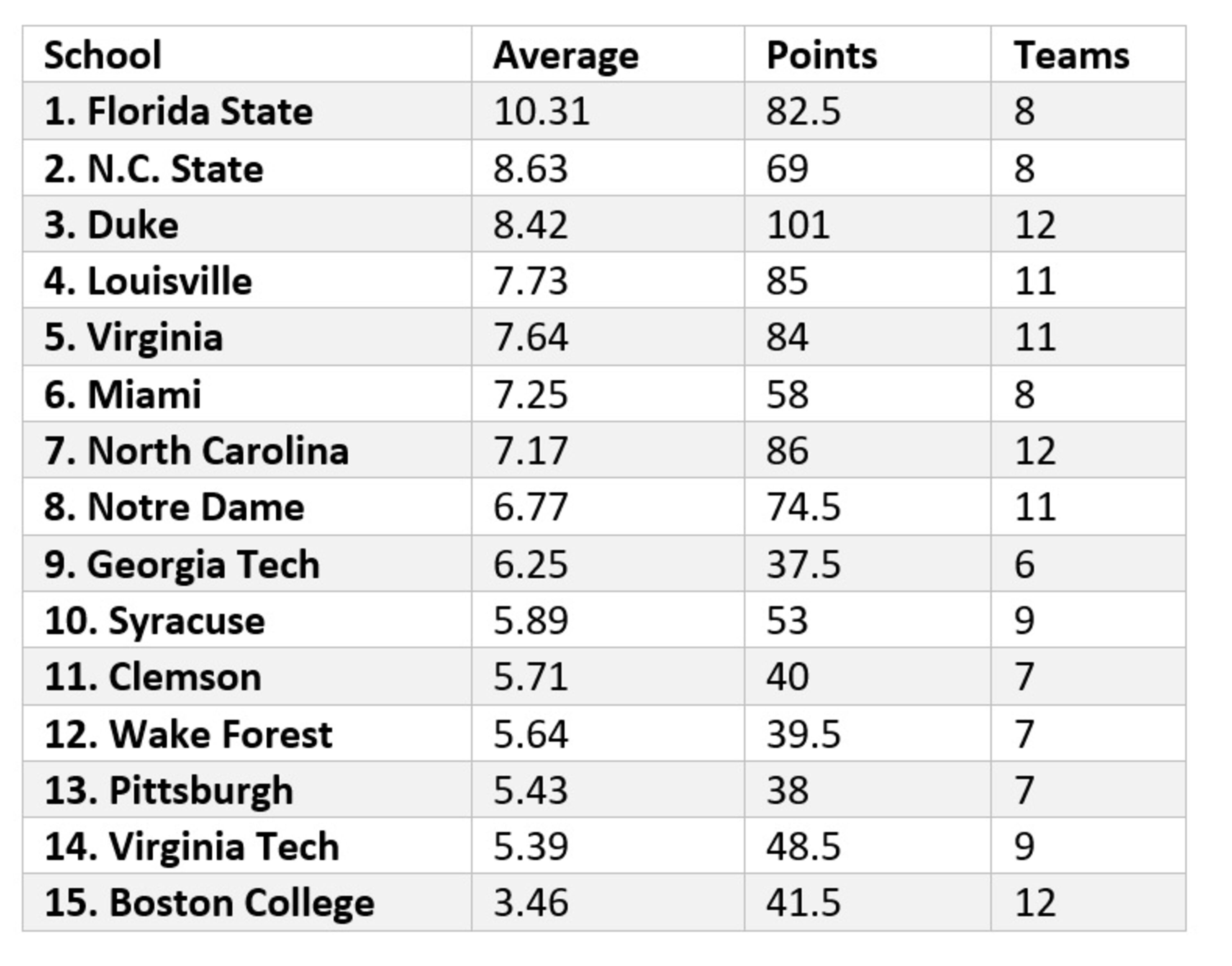 Against conference competition, FSU teams finished higher in the standings on average than any of their 14 peers, and by a considerable margin. The Seminoles were followed by N.C. State in second, Duke in third and Clemson in fourth. Georgia Tech, whose golf team claimed its 17th ACC title earlier this month, was 12th.