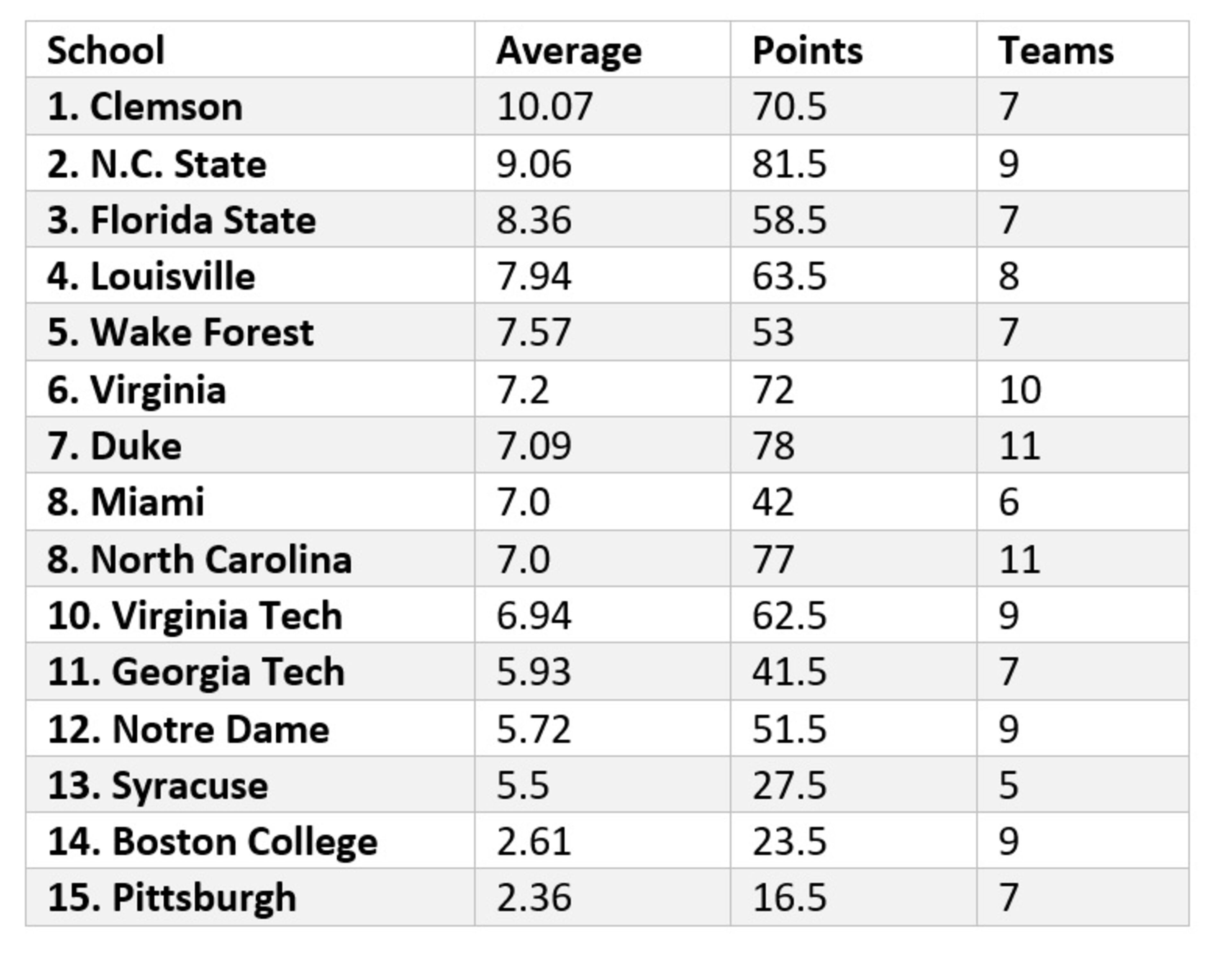 Teams were rated using a system in which points were awarded based on placement in league standings. For sports in which all 15 teams competed, 15 points were awarded for first place, 14 for second and so on. The system corresponded for sports with fewer than the full 15 teams. In wrestling, for instance, a sport in which only six ACC teams compete, champion Virginia Tech received six points. (It is not an entirely equitable system; in proving themselves the best wrestling team in the ACC, the Hokies lowered their overall average. The rating system also doesn’t include sports that the ACC does not sponsor, such as ice hockey and gymnastics.)