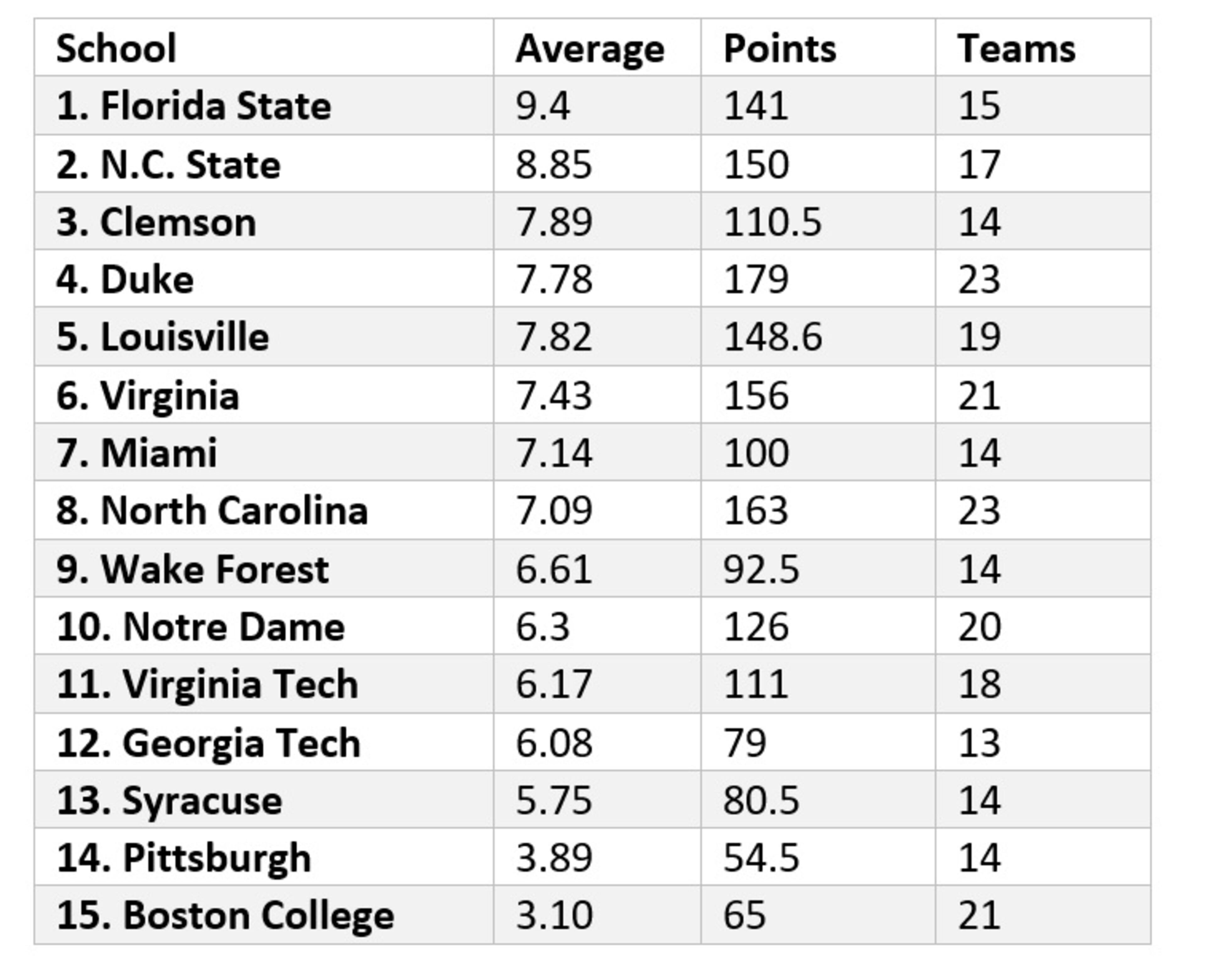 Clemson had the highest average for men’s sports on the strength of its football championship and its baseball team, which finished the regular season tied with North Carolina for the best conference record. N.C. State and Florida State followed in second and third, respectively.