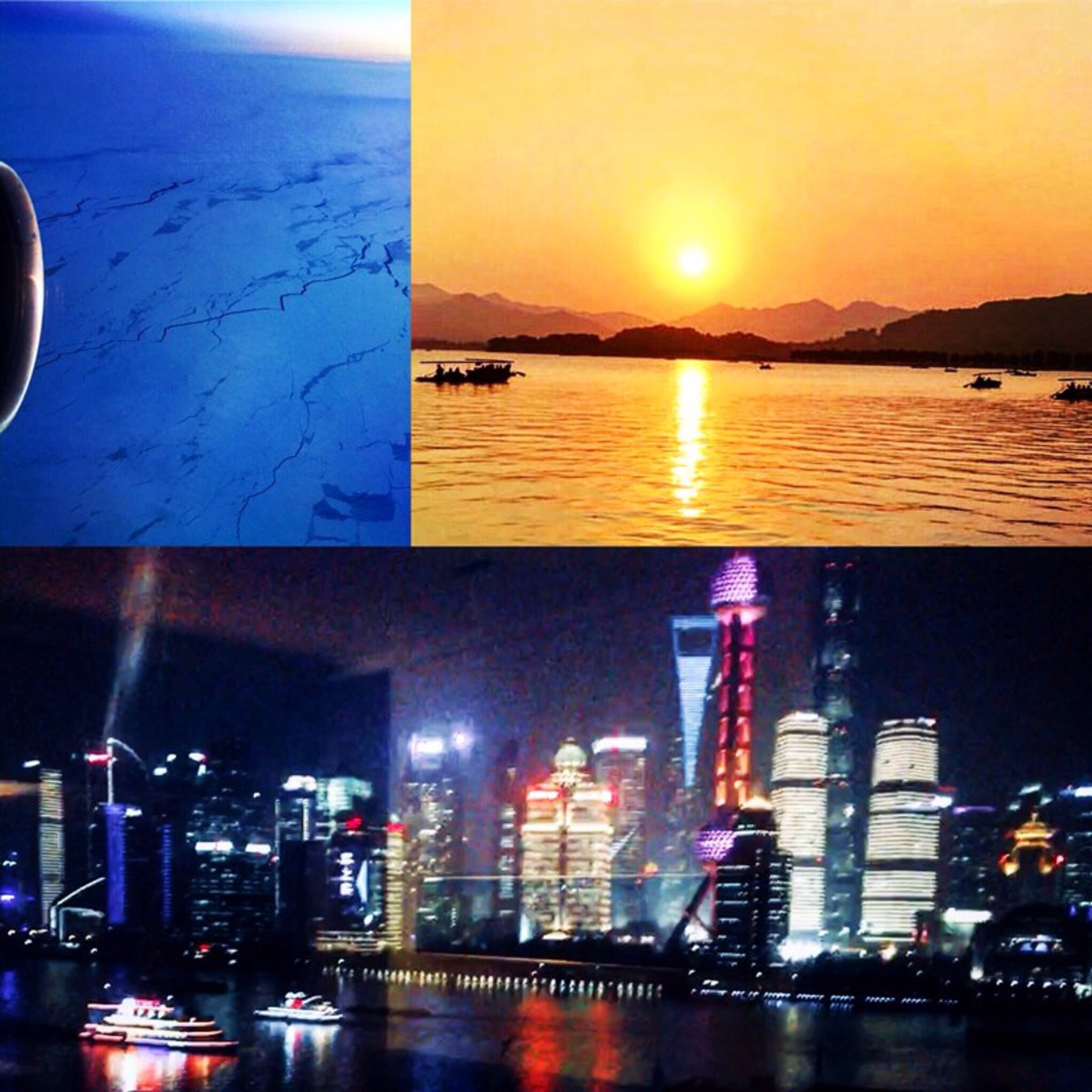 A collage of photos: Clockwise from upper right, a photo of Siberia taken during the Detroit-Shanghai flight; West Lake in Hangzhou at sunrise; the Shanghai skyline.
