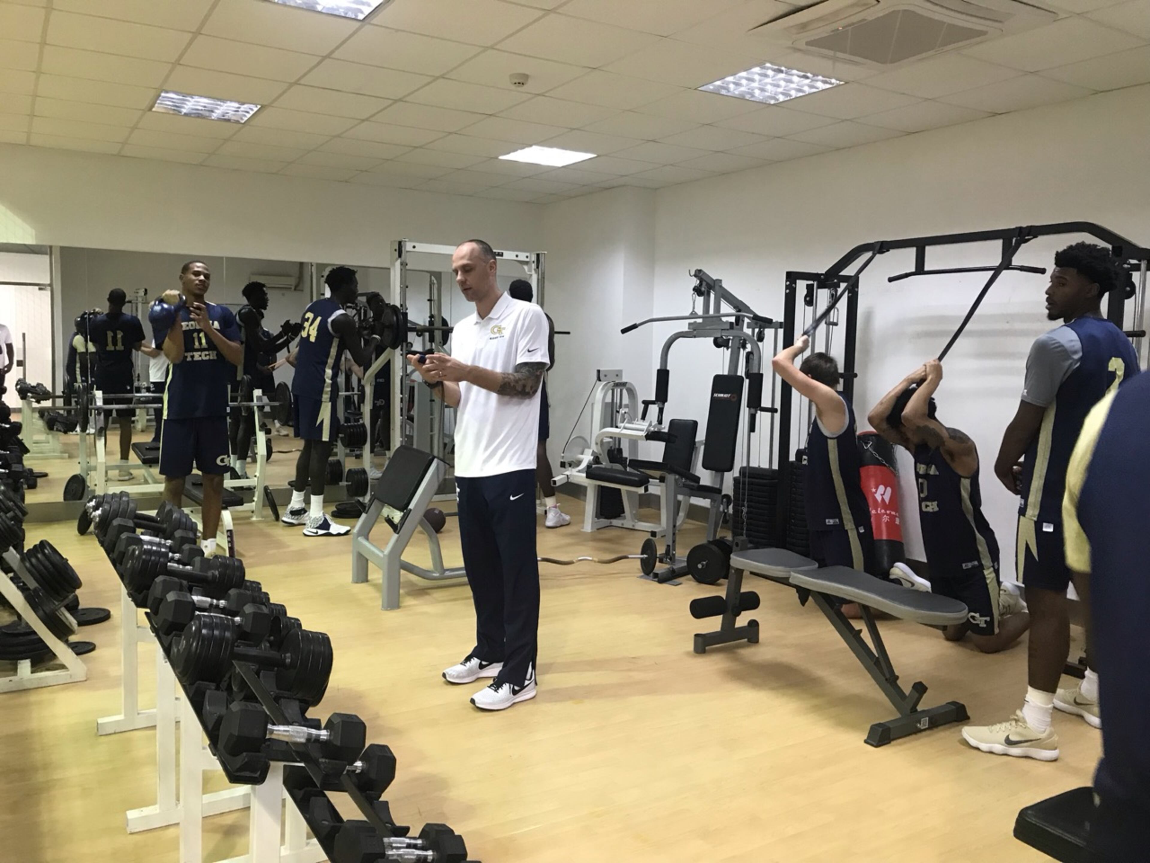 Strength and condtioning coach Dan Taylor leading the team through a workout at the Hangzhou International School. Taylor occasionally had to be creative in using available tools to train the team. At one gym, the team used an ab roller wheel, resistance bands, a staircase and a towel for a multi-station workout.