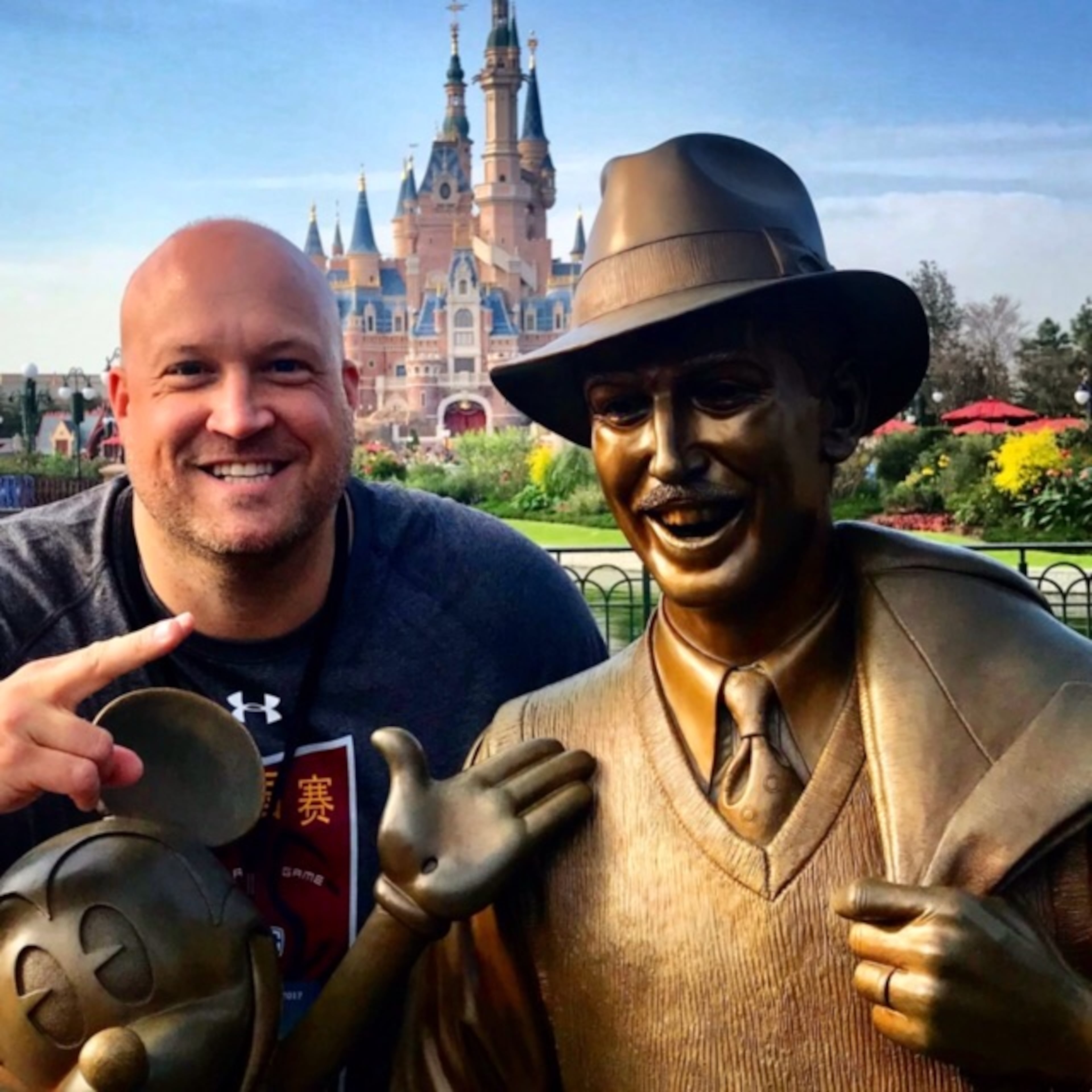 Swartz with Walt Disney and Mickey Mouse at Shanghai Disney Resort.
