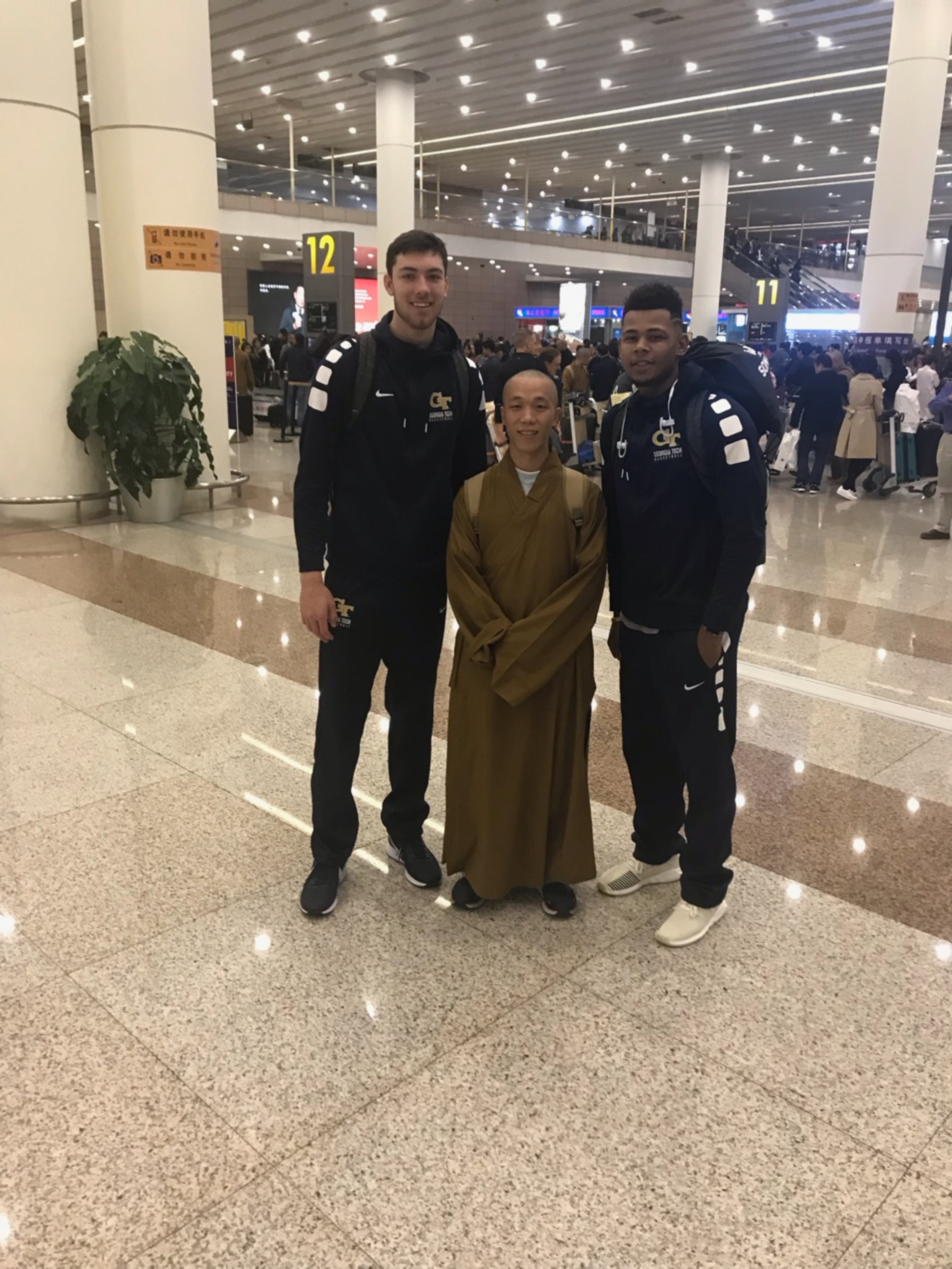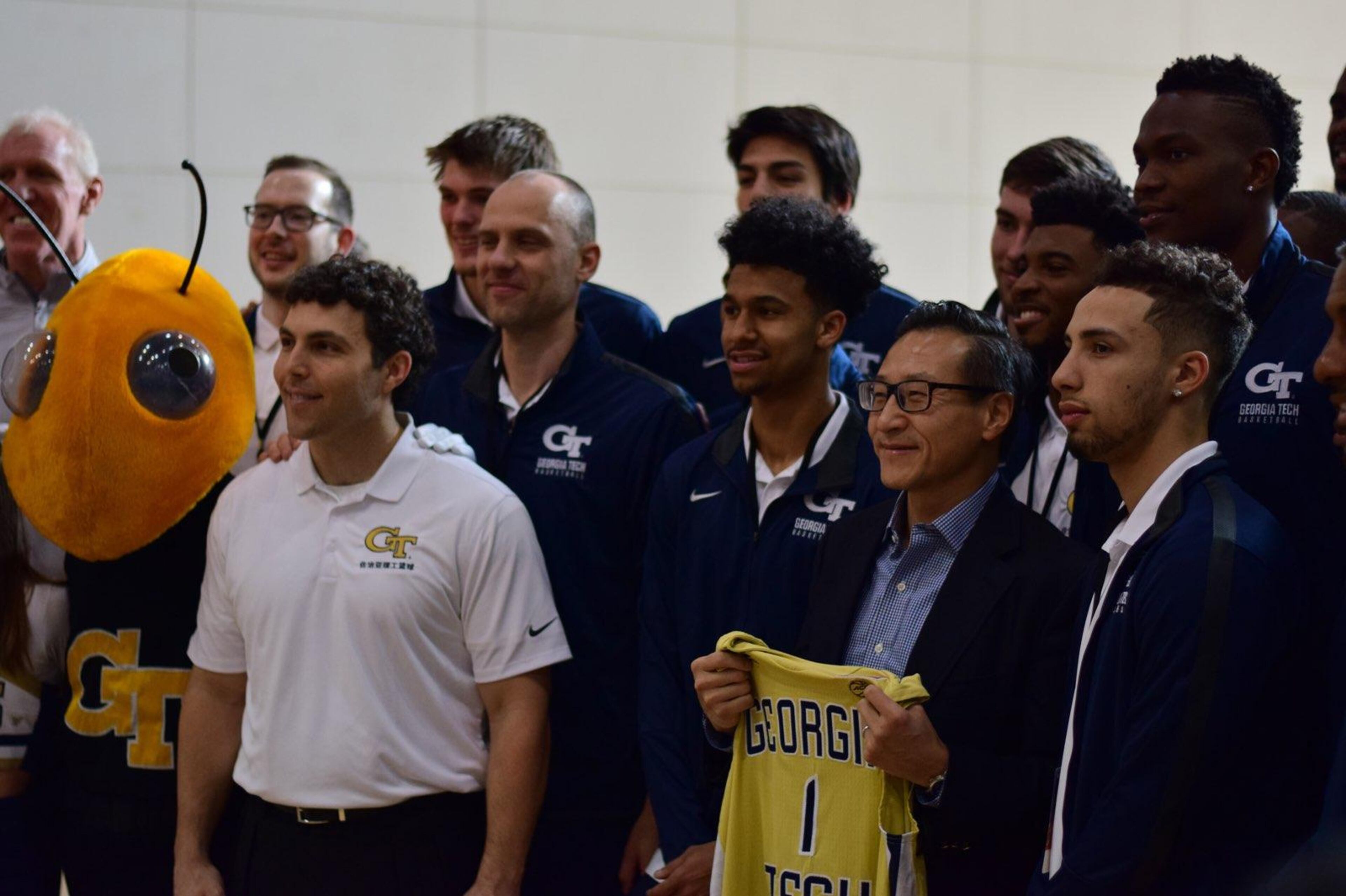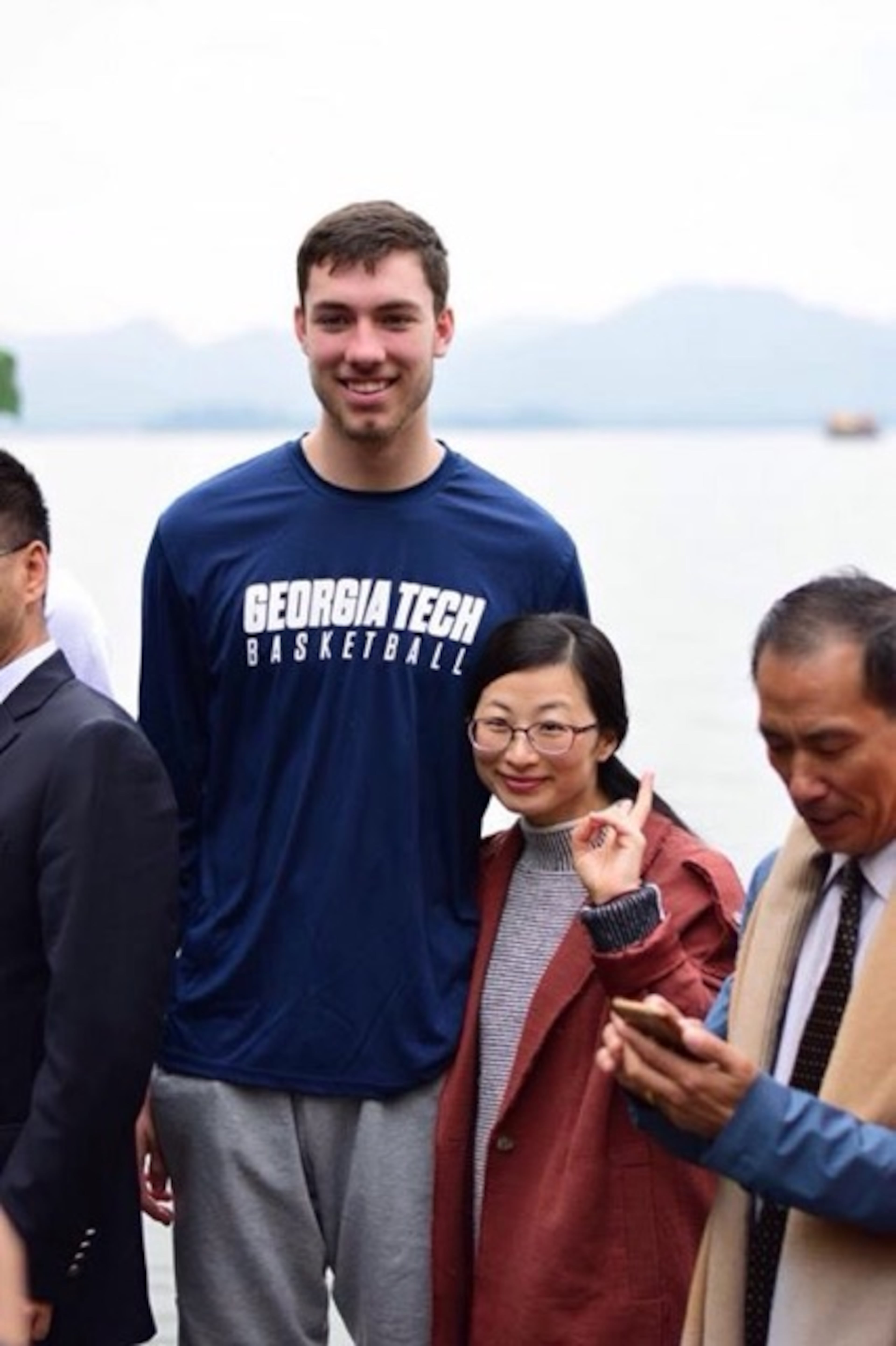 Students from the Hangzhou International School posing in front of a display at Baoshan Arena featuring Moore. The students had been allowed to watch Tech practice at their school, and Moore interacted with them after the practice, talking, shaking hands and putting on a dunking exhibition with teammates, time that evidently made an impression. Moore is a natural people person who provided as much goodwill as any member of the team.