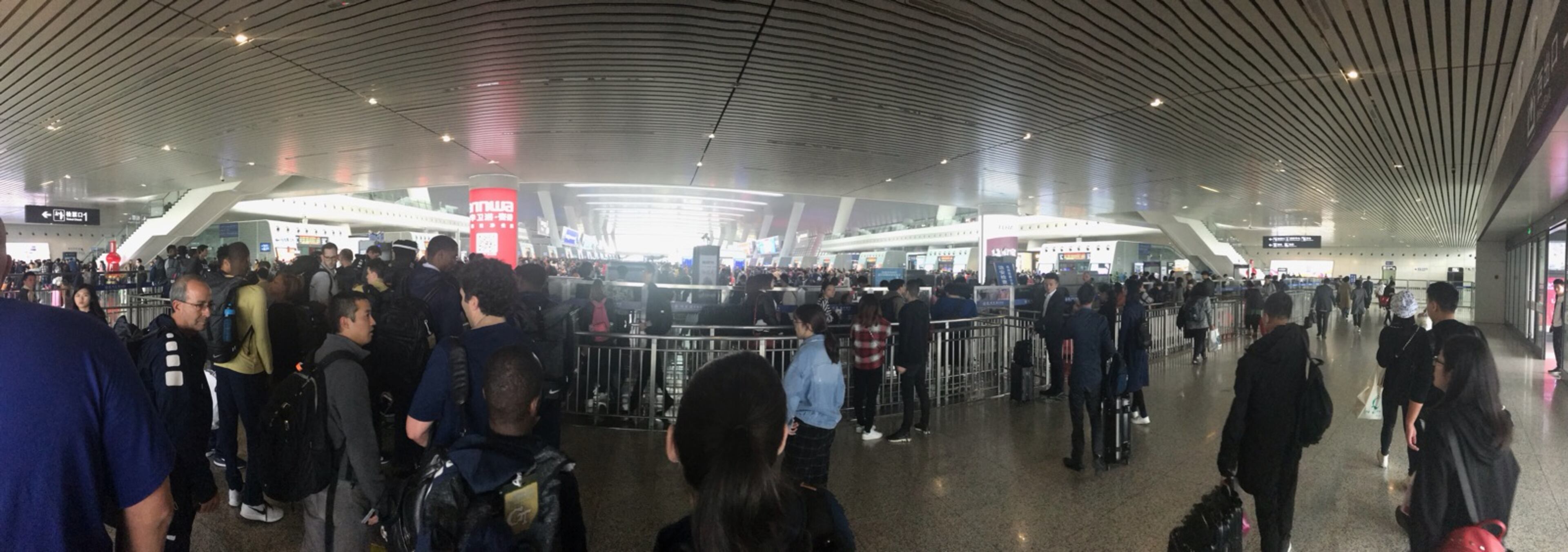 The Tech traveling party at security in Hangzhou East Railway Station.